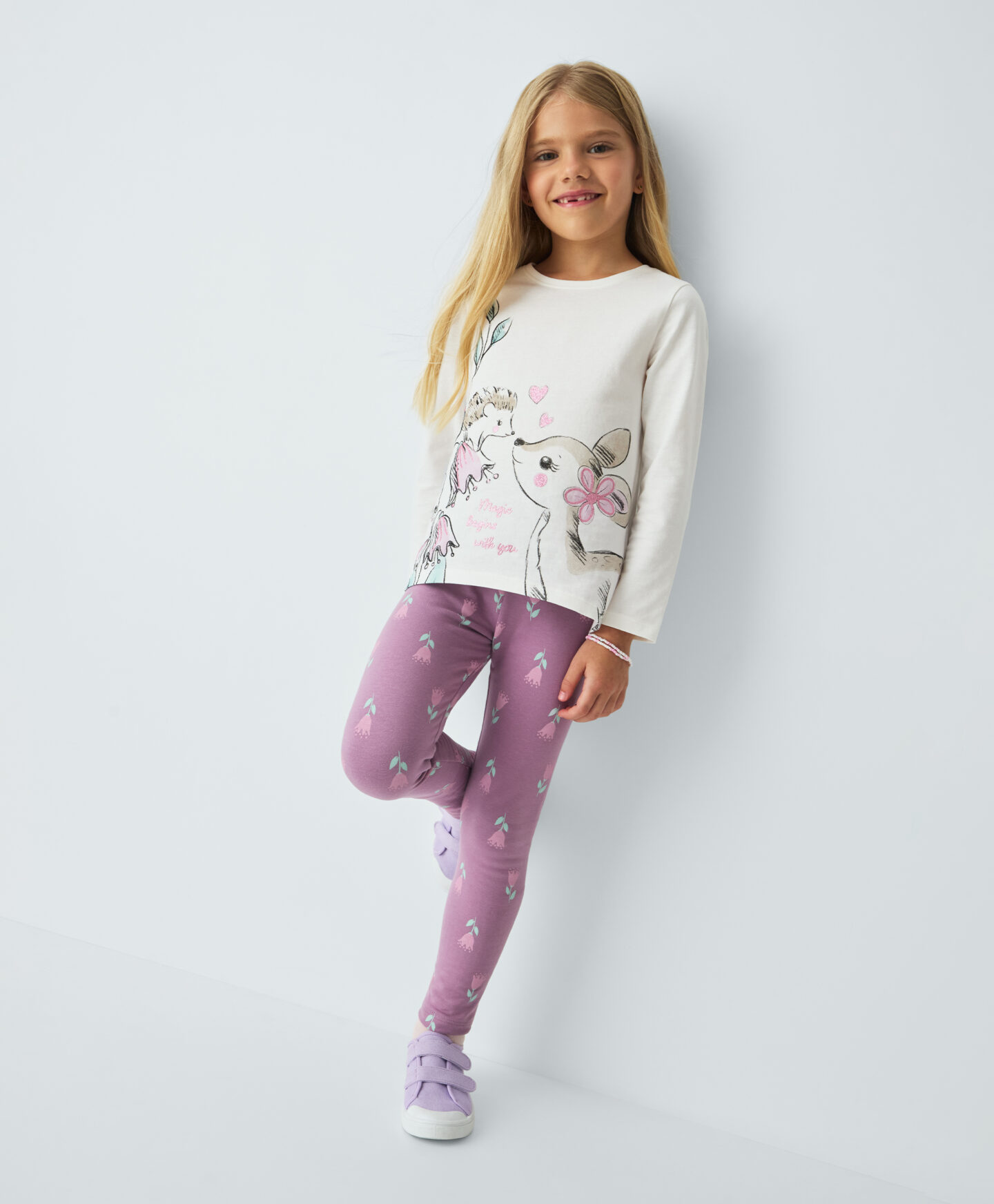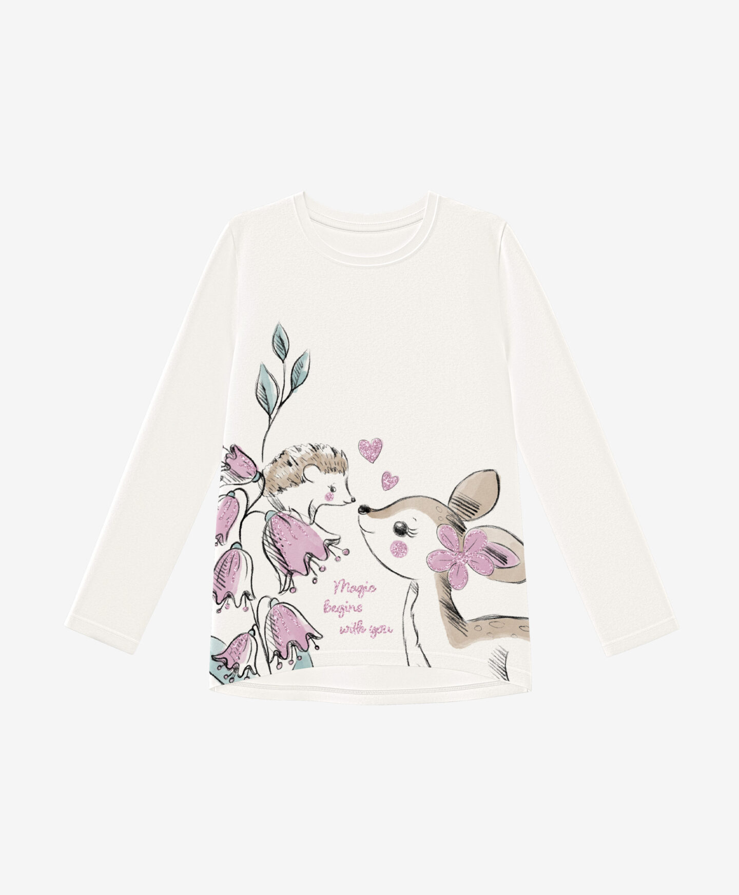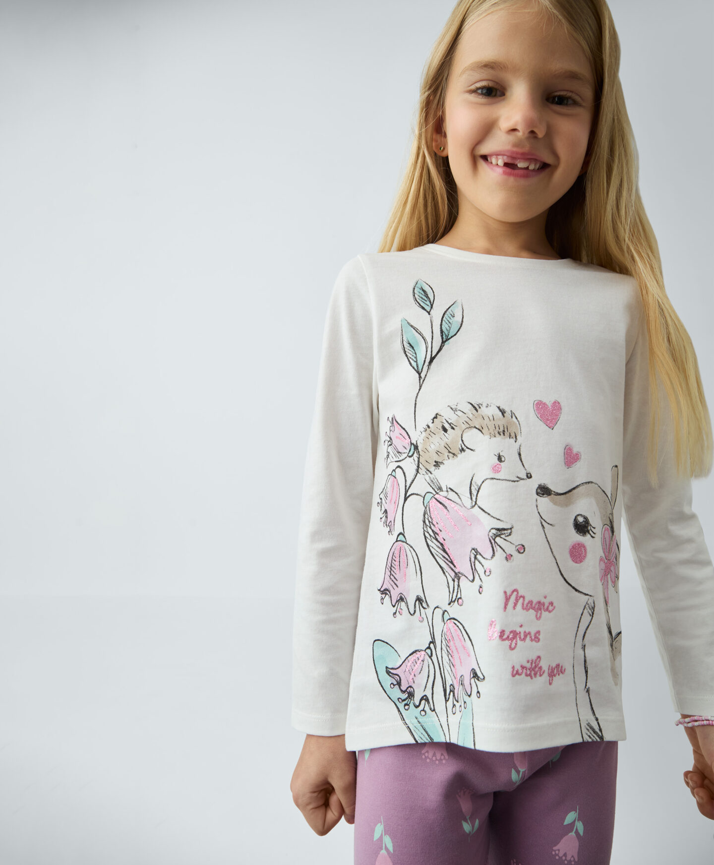 Блузата за момичета, изработена от 100% памук, е с дълги ръкави и красива щампа отпред. Съчетава се перфектно с клина от същата колекция. Подходяща е за детска градина, училище или свободно време. Мекият материал нежно обгръща кожата, осигурявайки топлина на вашето дете в първите есенни дни. Приглушеният цвят ще послужи като основа за много различни тоалети.