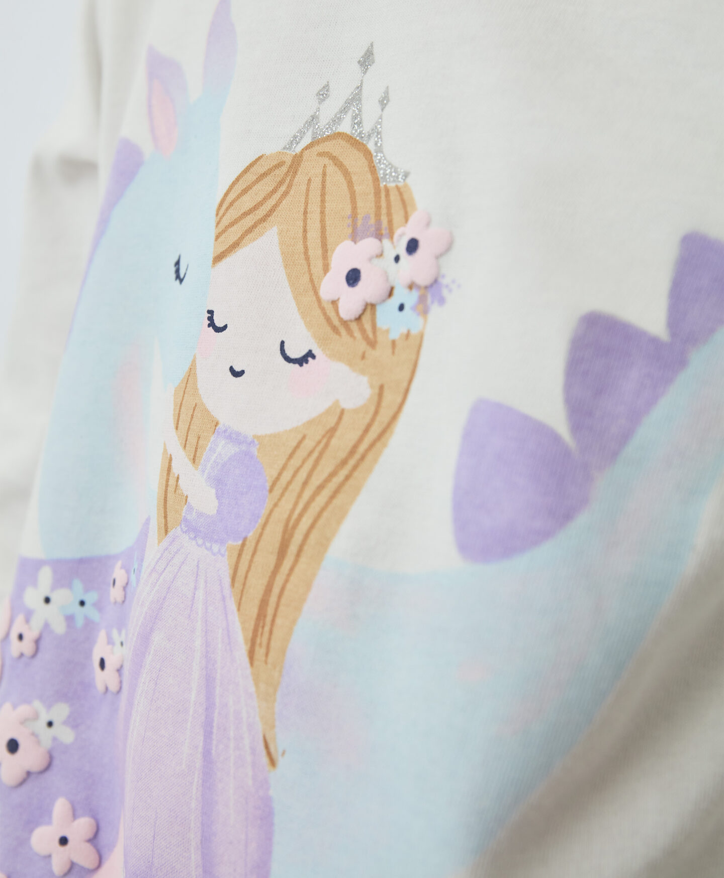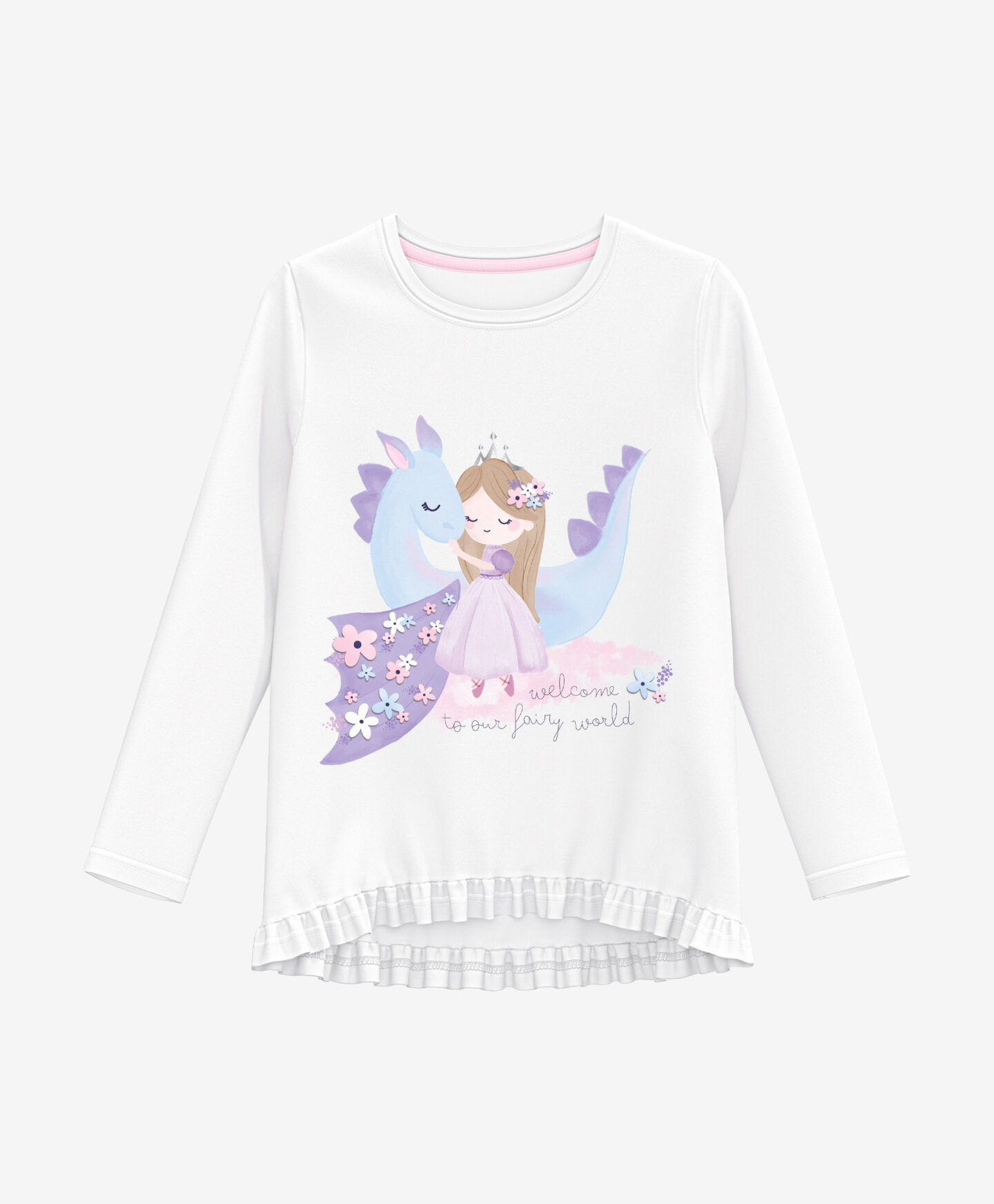 Блузата с волани за момичета е изработена от 100% мек, дишащ памук. Тя е лека, приятна на допир и нежно обгръща детската кожа, а дългите ръкави осигуряват топлина в есенните хладни дни. Блузата перфектно допълва изолираните клинове от колекцията.