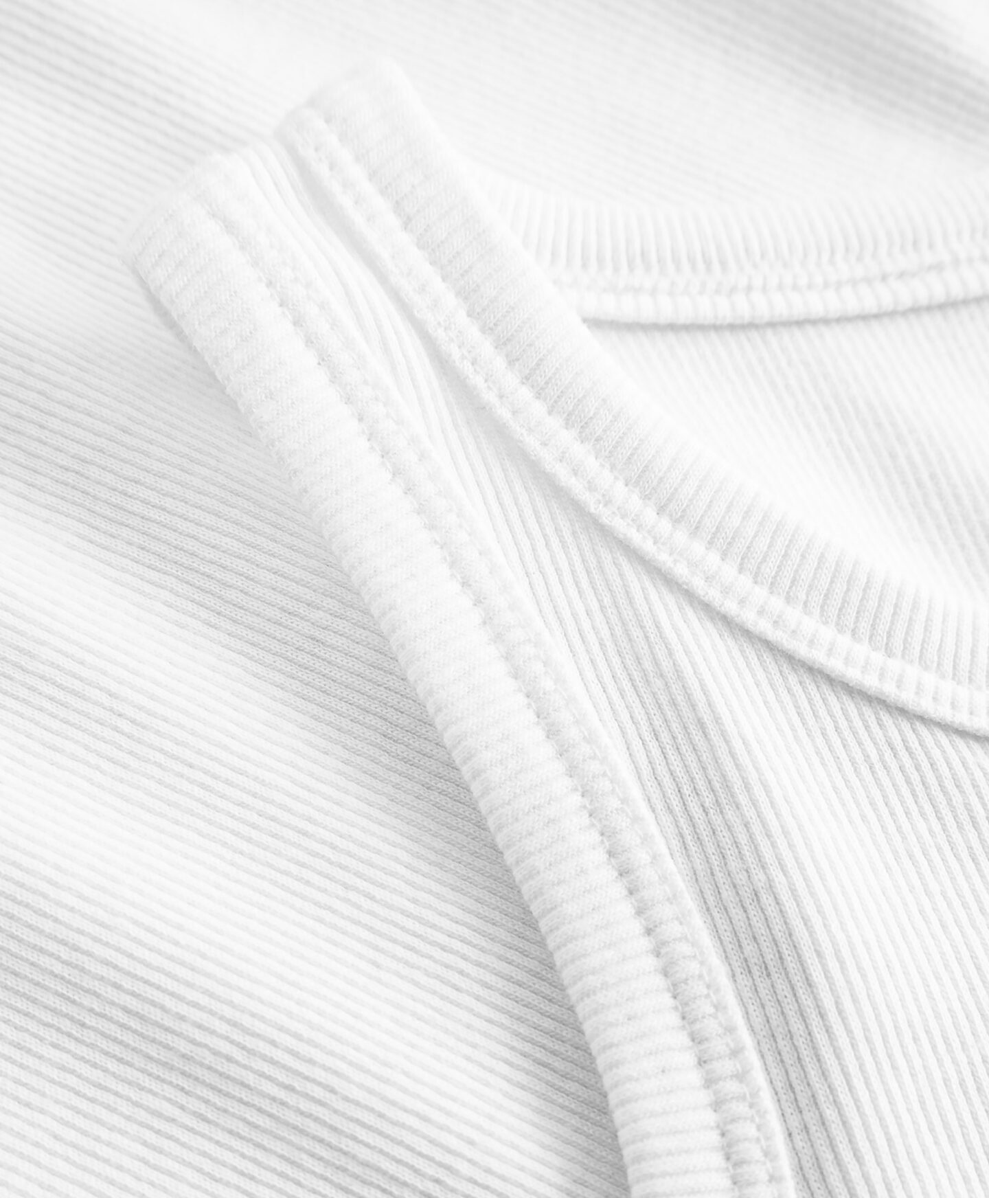 Този бял потник за момичета е олицетворение на простота и комфорт. Оребрената плетка не е само за естетика. Тази тъкан прави материала изключително еластичен, осигурявайки перфектно прилягане, без да ограничава движението. Широките презрамки и по-дълбоките отвори за ръкави гарантират комфорт.