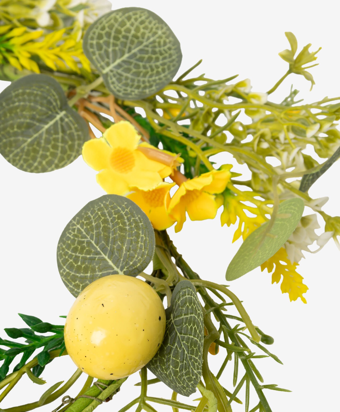Този великденски венец с жълти цветя е перфектен като декорация за врата, красиво допълнение към хол или офис, или като декоративен елемент за великденски партита и тържества. Можете да го използвате и за създаване на пролетна аранжировка с ароматни свещи и дизайнерска ваза. Предлагаме разнообразие от дизайни, от които да избирате.