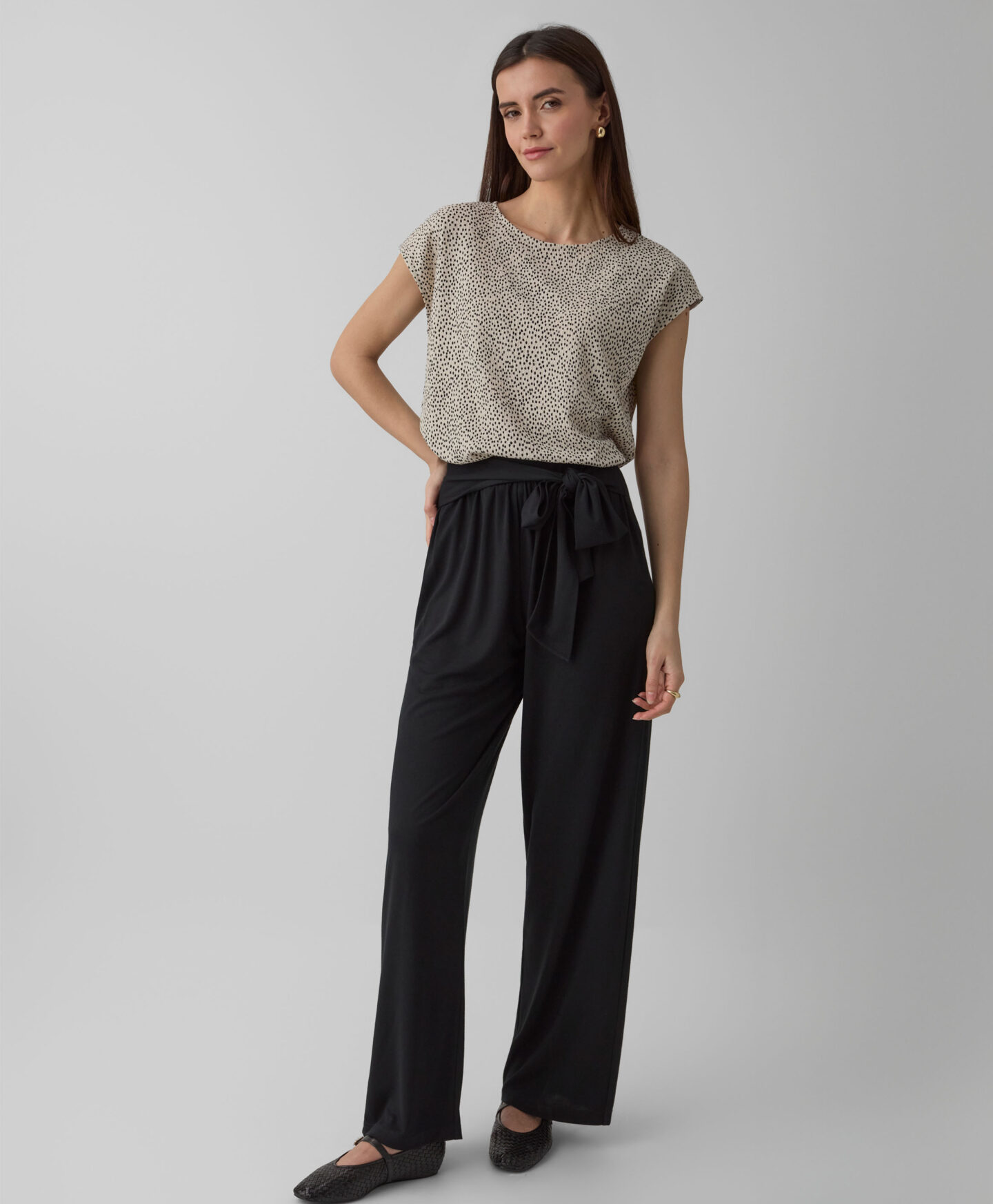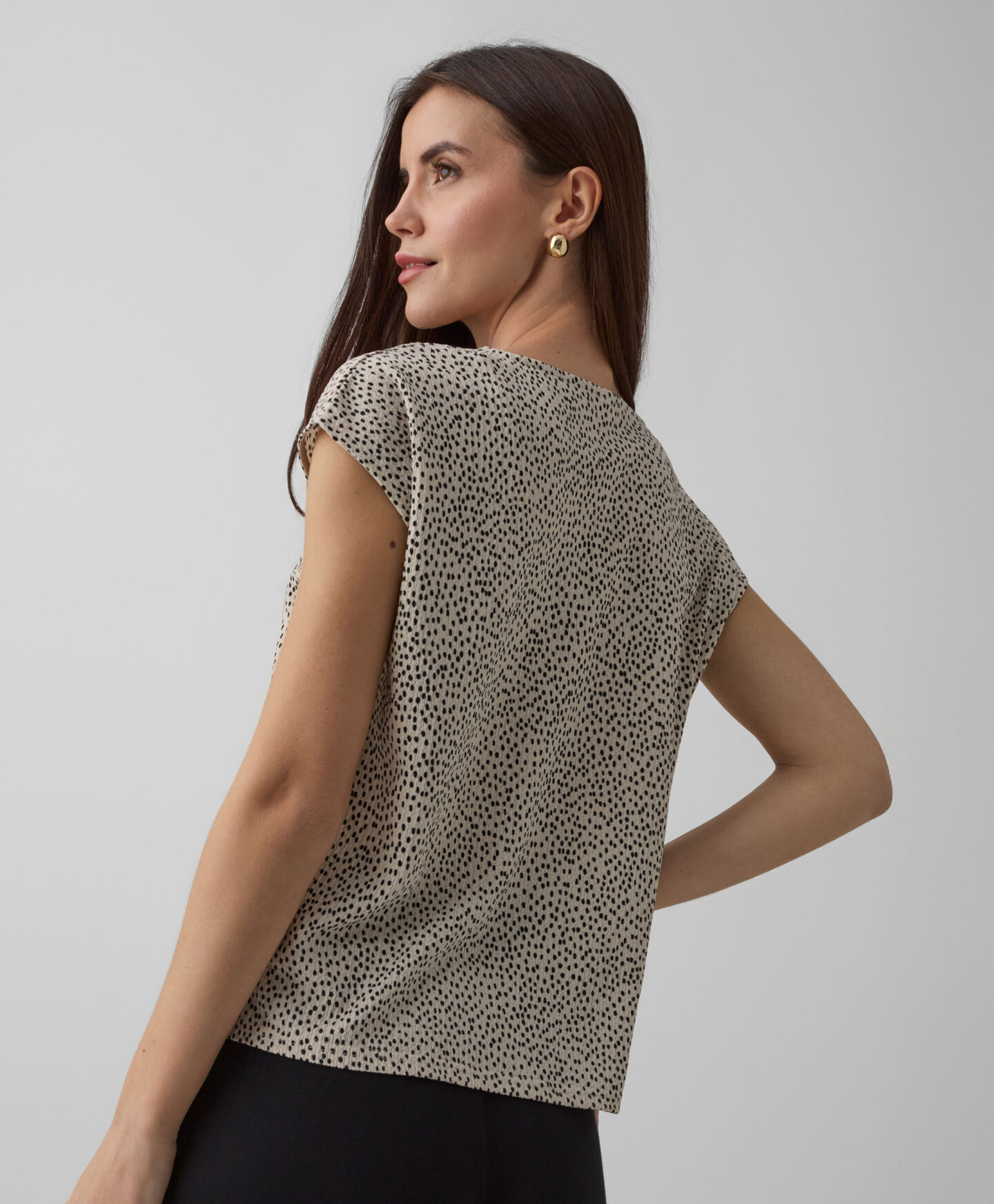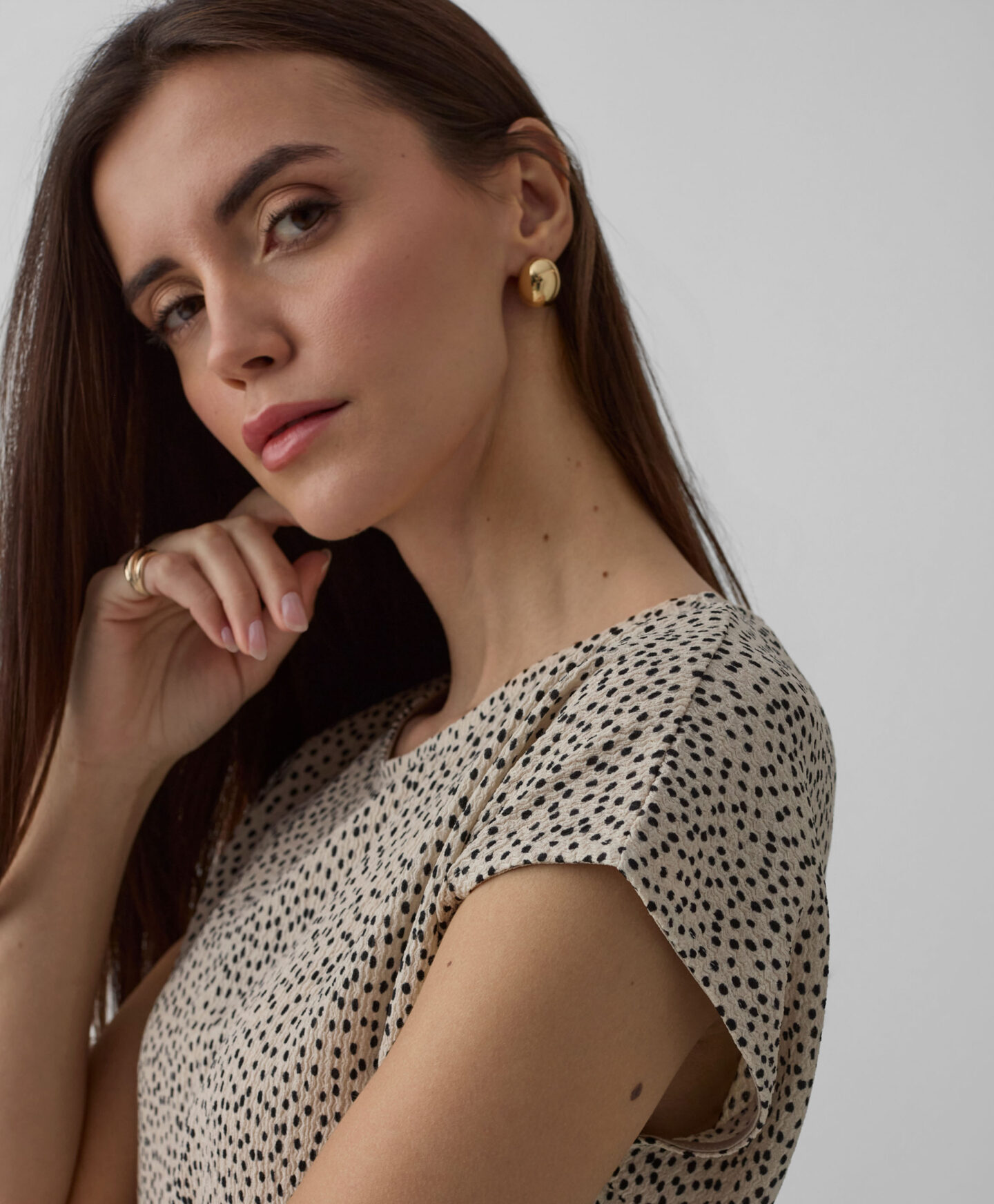 Дамска бежова риза с намачкан шарен мотив създава комплект с пола от колекцията. Можеш също така свободно да я комбинираш с любимите си дънки или по-елегантни панталони. Късият ръкав я прави идеална за многопластово стилизиране в преходни периоди. Комбинира се както с класическо яке, така и с гладък кардиган.