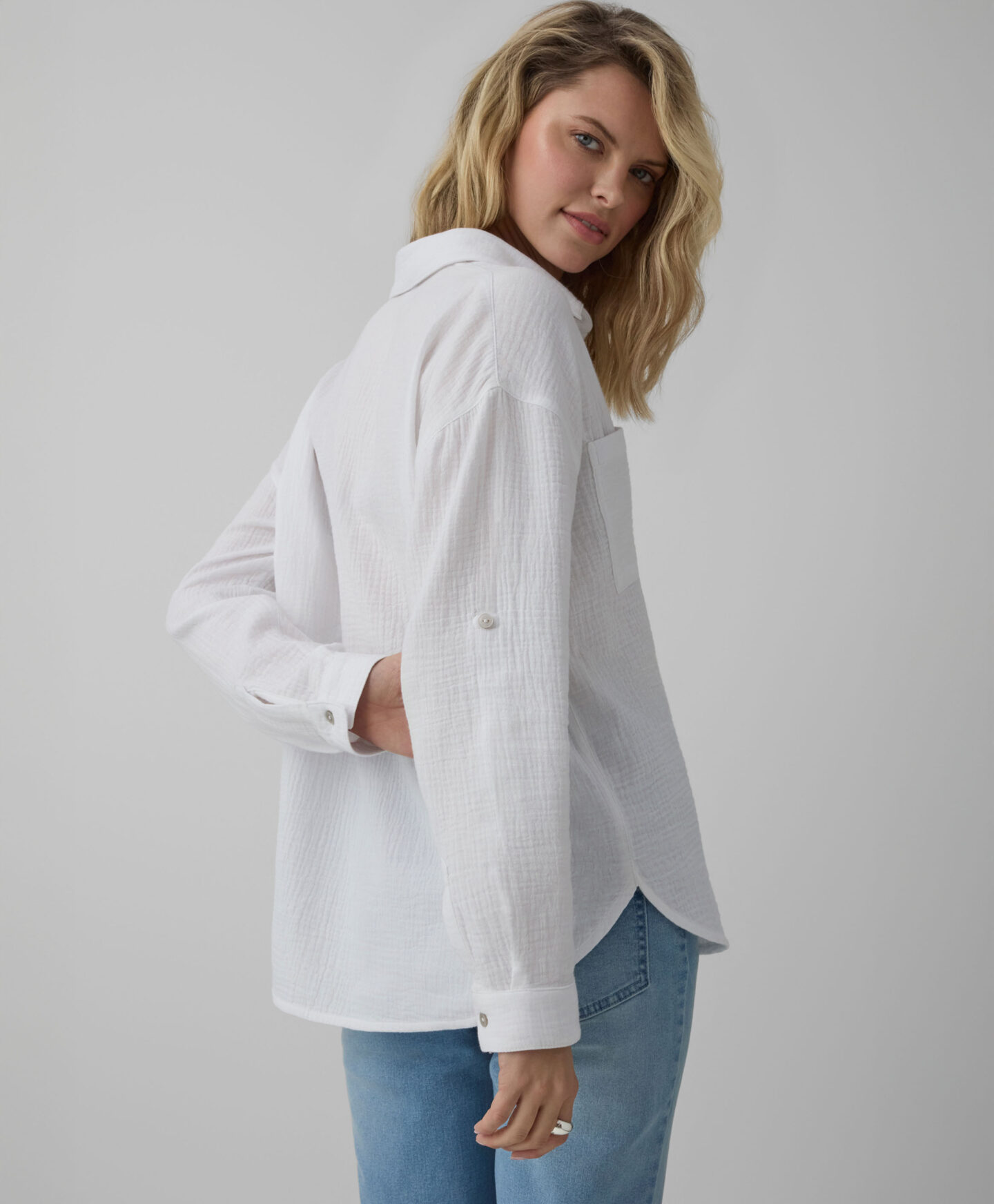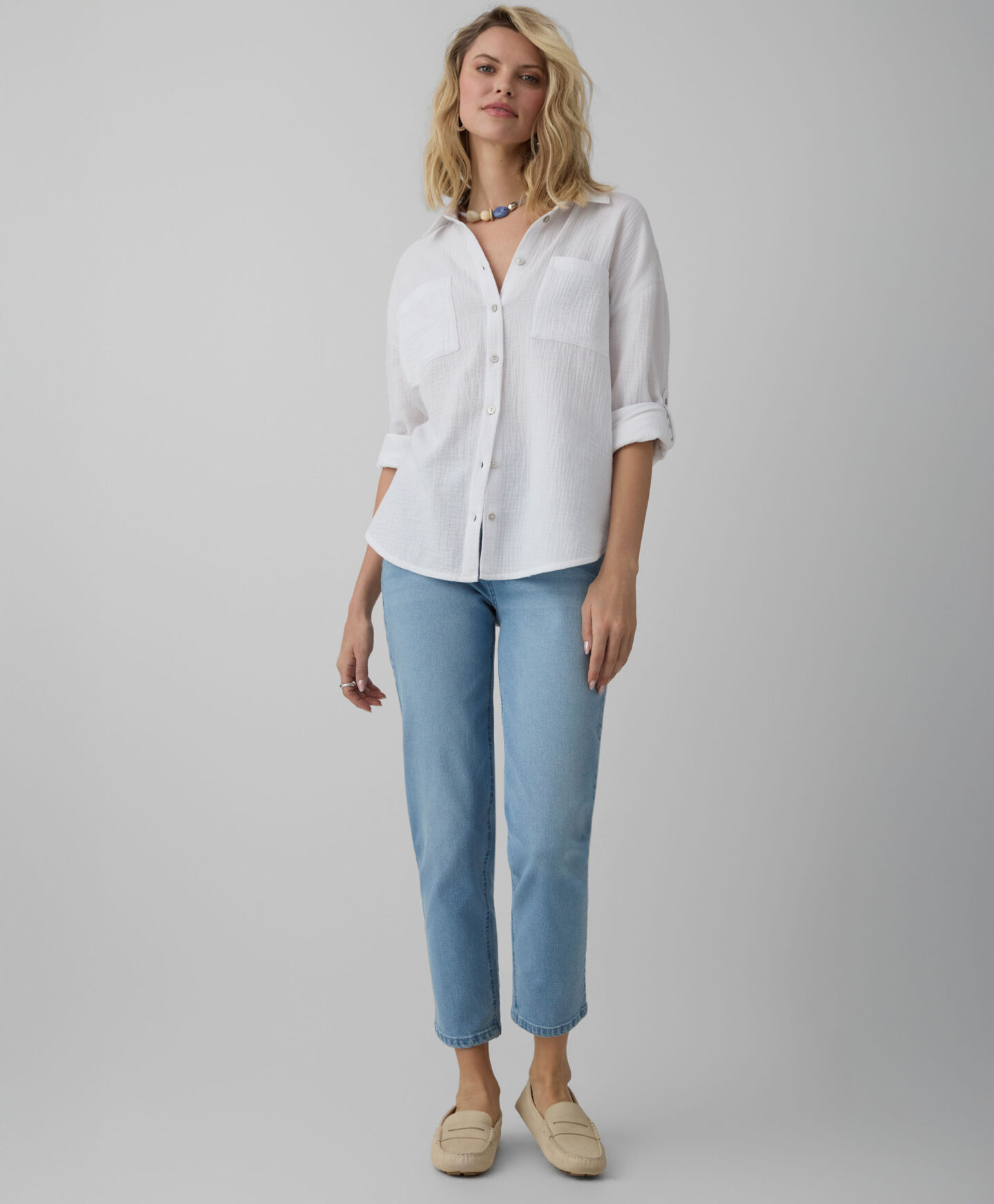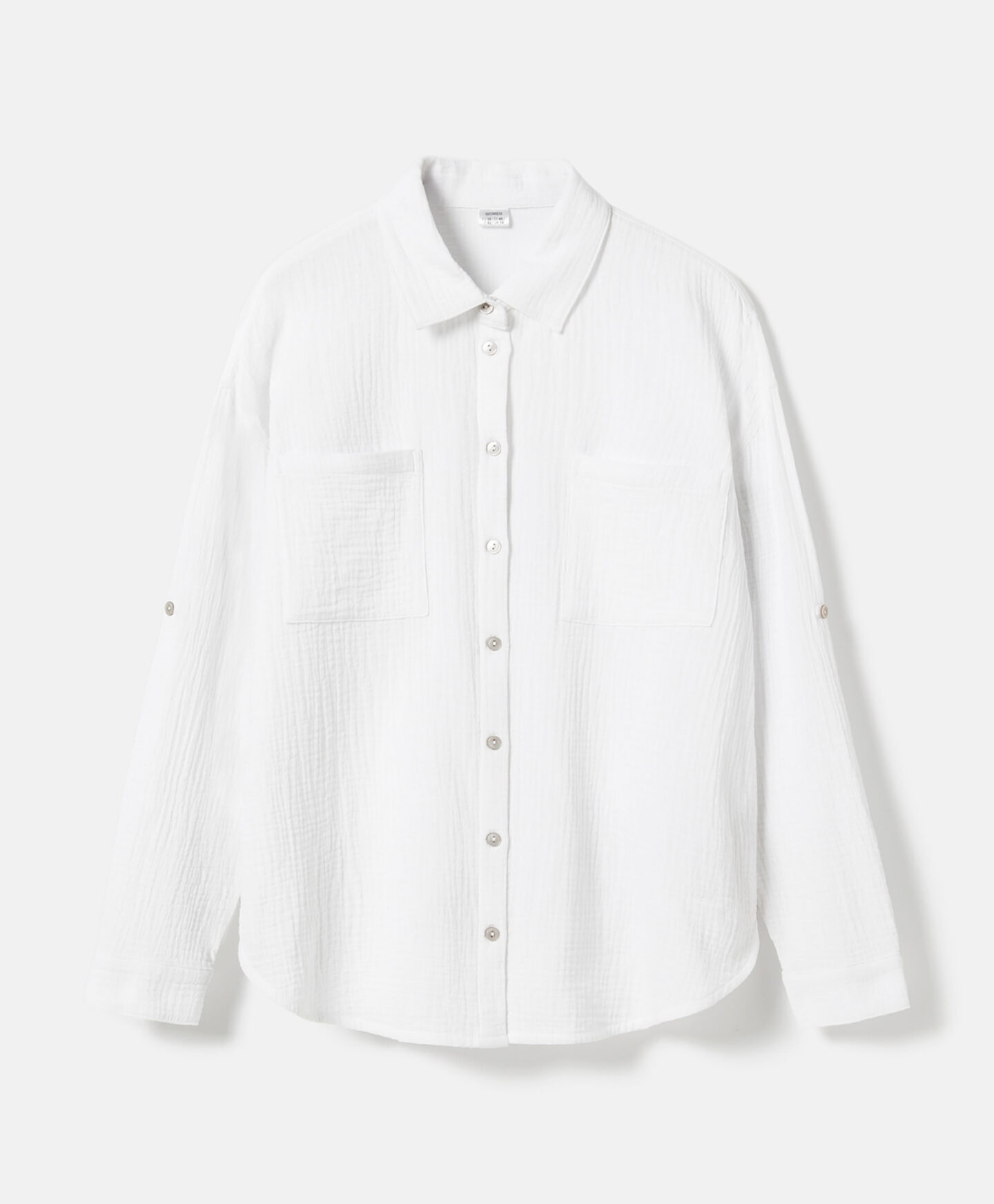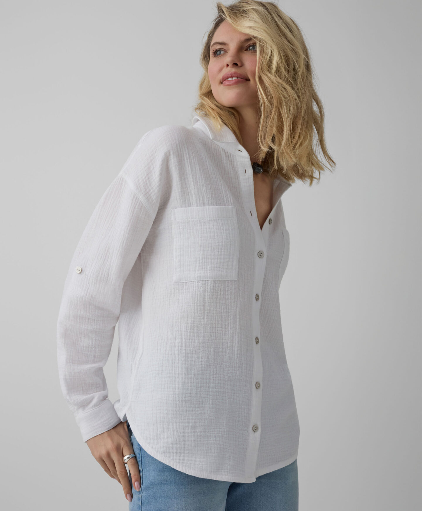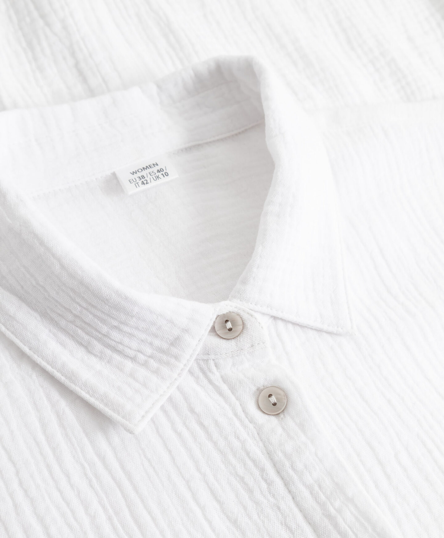 Дамска бяла риза от 100% памук е предложение за всяка жена, която търси естествени материали и изискан стил. Муселинът предлага изключителна мекота, лекота и позволява на кожата ви да диша. Универсалният бял цвят е синоним на вечен дизайн, който се съчетава прекрасно с всеки елемент от гардероба – от панталони до поли.