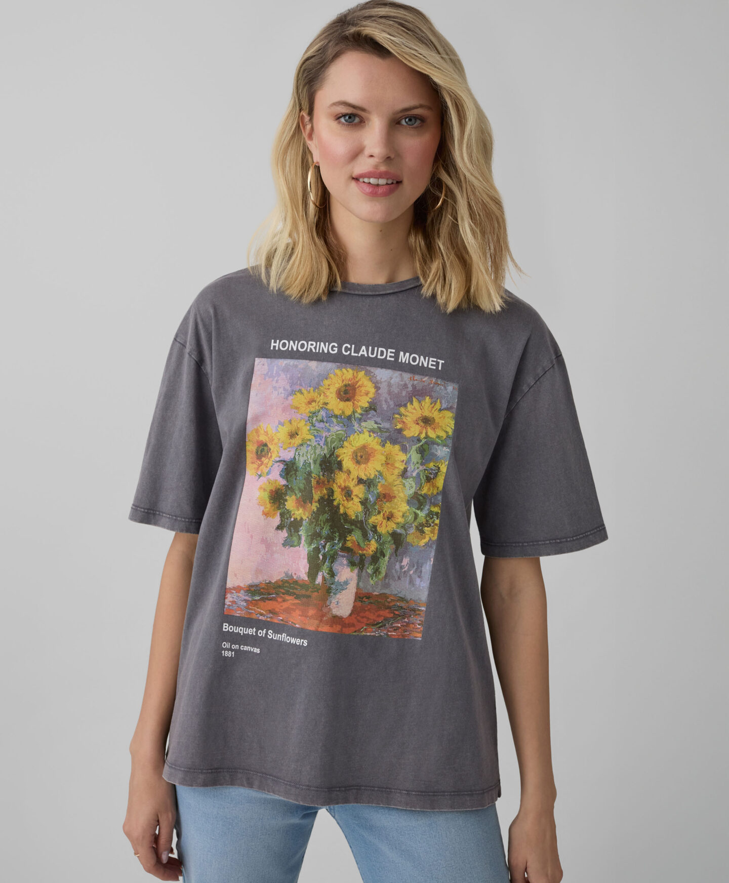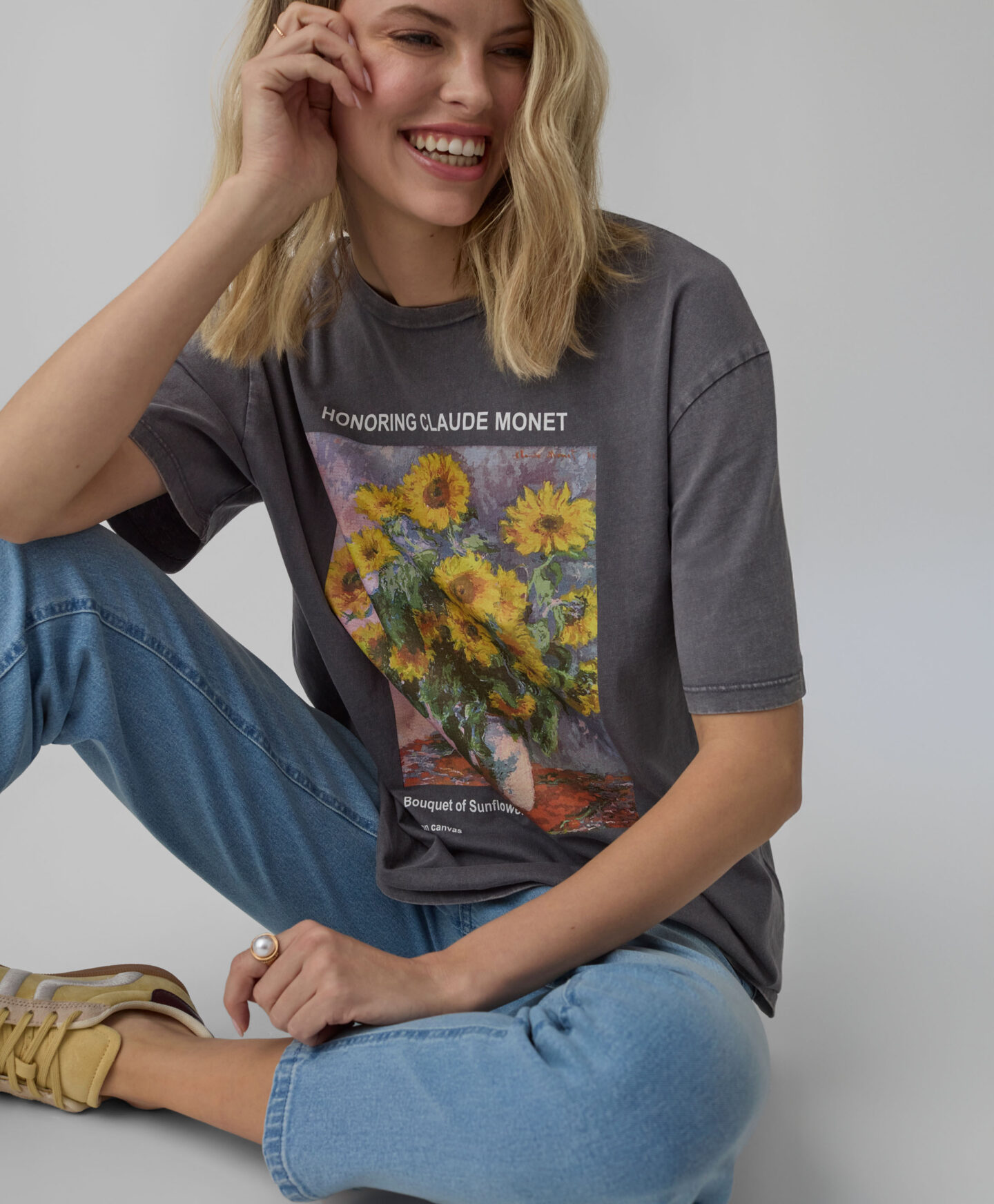 Дамска тениска от 100% памук с графика на слънчогледи ще бъде модна перла в гардероба ти. Тя е лека, мека и позволява на кожата ти да диша. Съчетава се както с дънки, така и с пола. Подходяща е за многопластови тоалети и за самостоятелно носене в първите топли дни. Класическата кройка и приятният на допир материал я правят любимата ти тениска в колекцията ни.