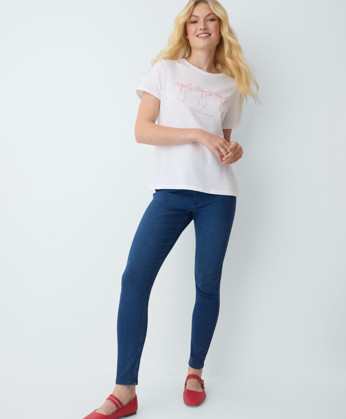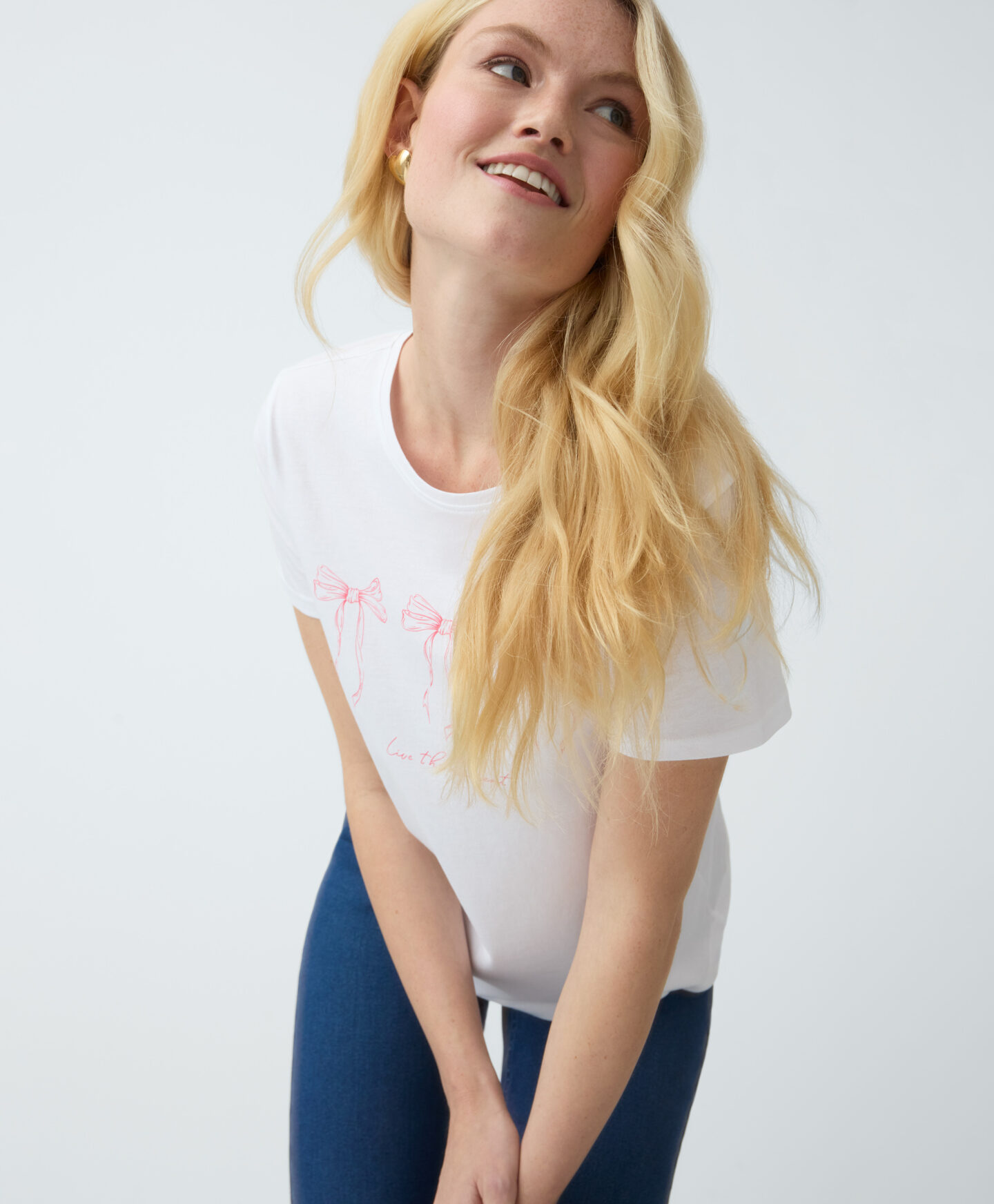Дамска тениска, изработена от 100% памук с преден печат, е перфектна за любителите на комфорта. Мекият материал нежно ще обгърне кожата ви, а универсалният цвят ви позволява да създадете много успешни тоалети. Стои чудесно, носена под пуловер или жилетка. В комбинация с класически дънки, тя създава идеален тоалет както за офиса, така и за университета.