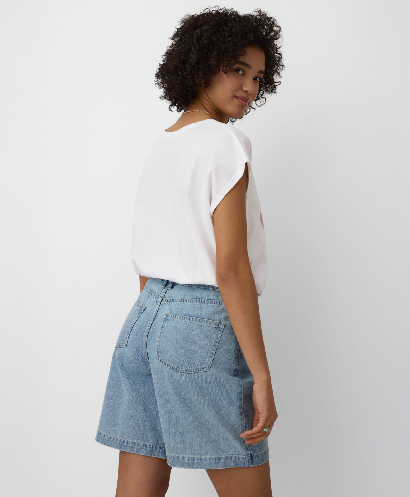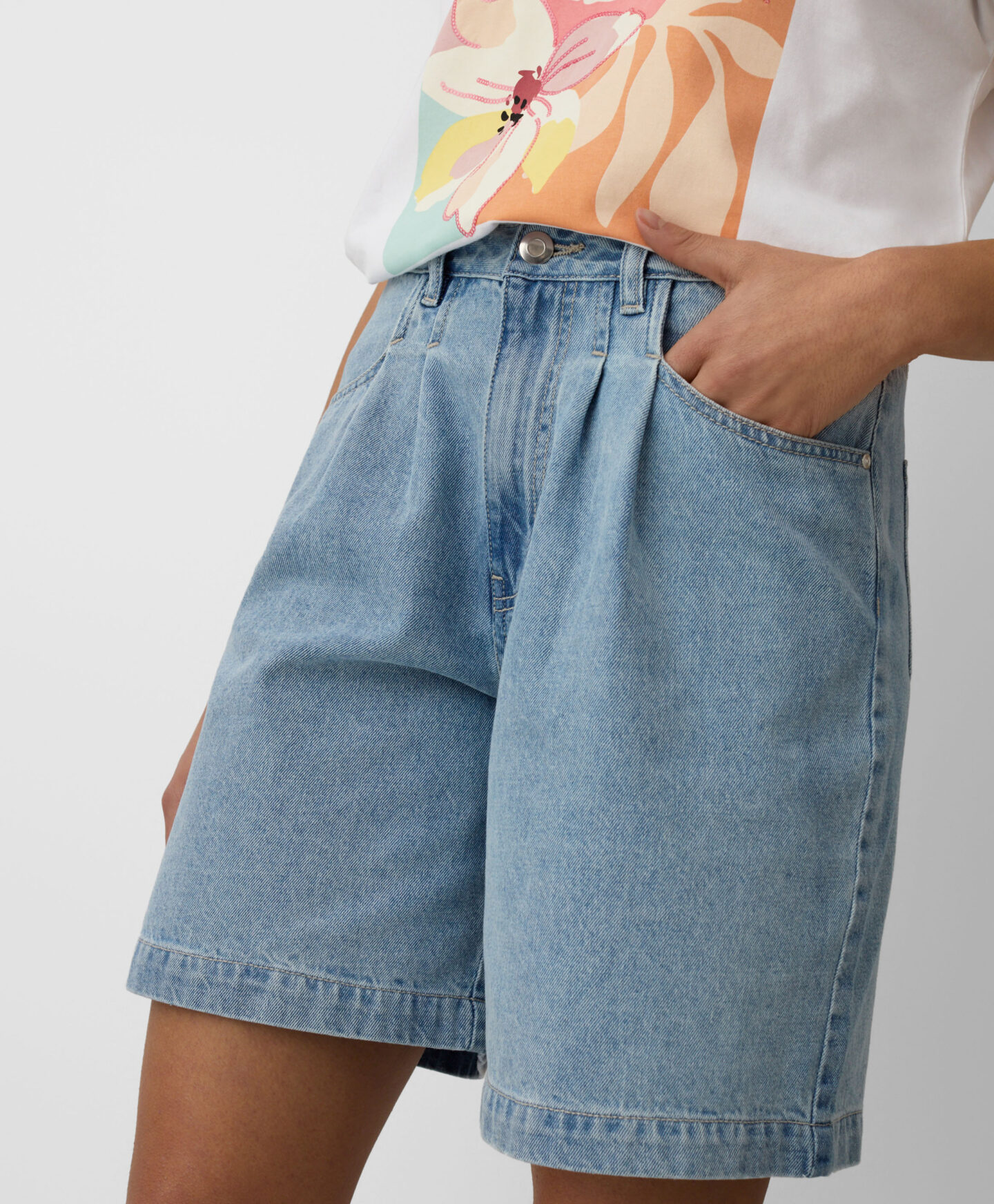 Тези дамски бермуди от 100% памук са перфектният избор за жени, търсещи комфорт и класически стил в топлите дни. Свободната кройка позволява пълна свобода на движение, а универсалната дължина на крачола подхожда на всички типове тяло. Вечният деним позволява пълна гъвкавост при стилизиране.