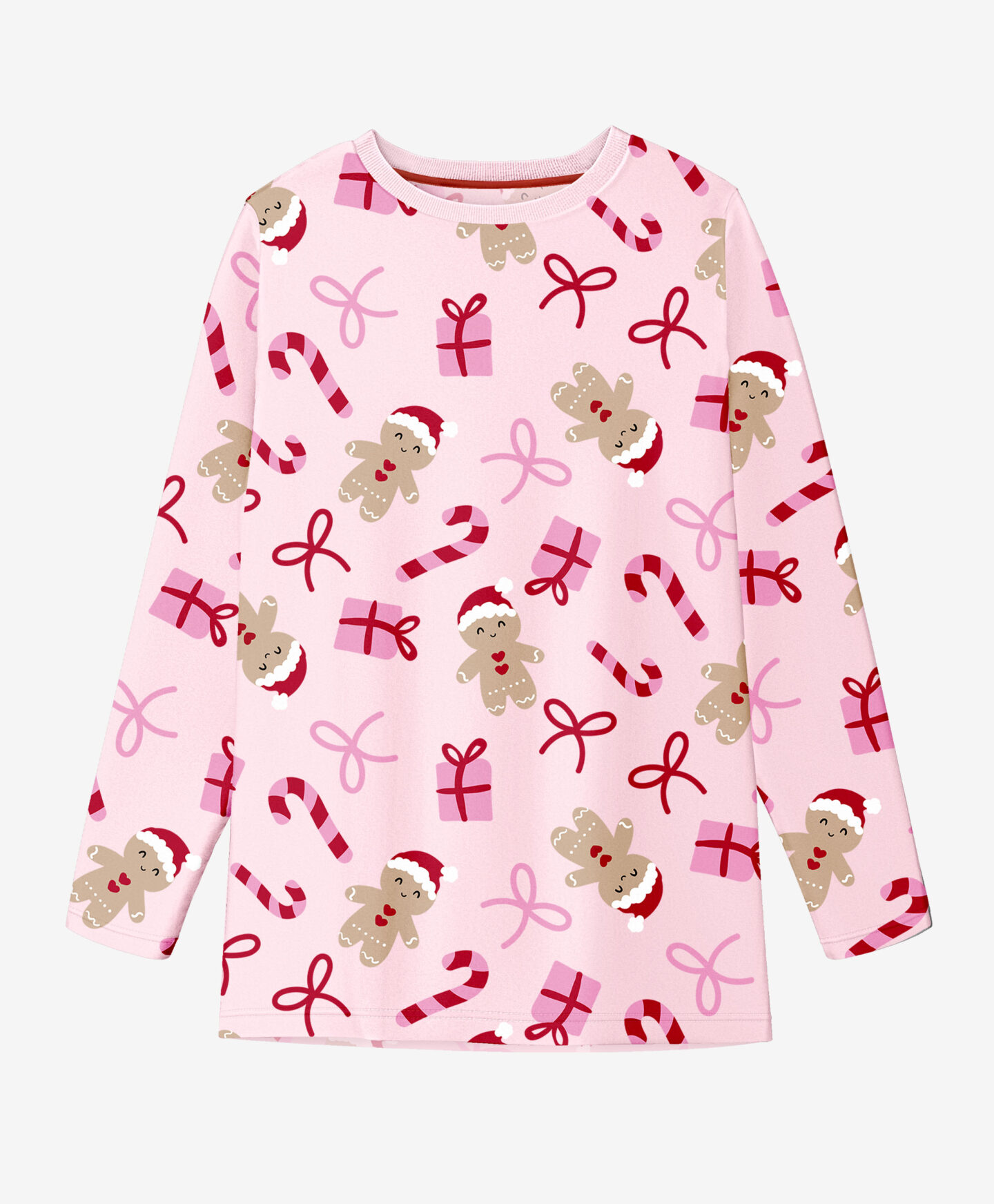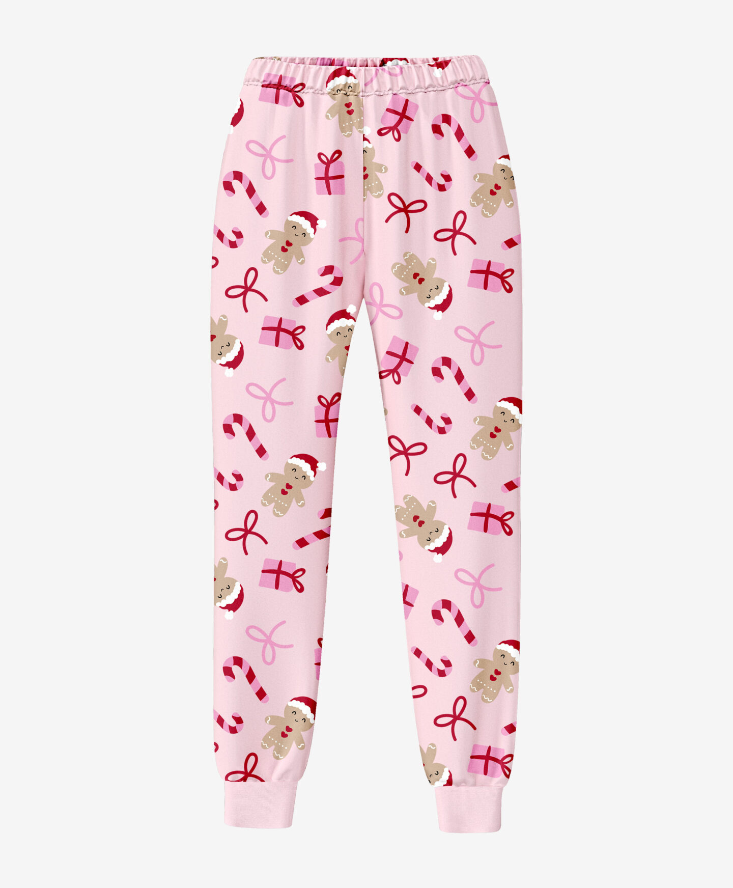 Дамска кадифена пижама с празничен мотив на меденки, подаръци и панделка е чудесна идея за подарък. Комплектът се състои от риза с дълъг ръкав и панталон, изработени от мек, топъл кадифе, което го прави идеален за зимни нощи.