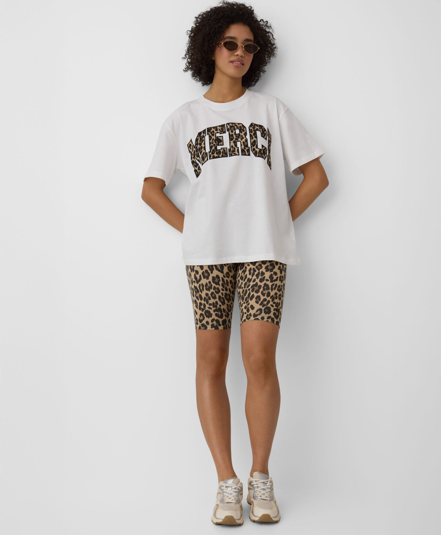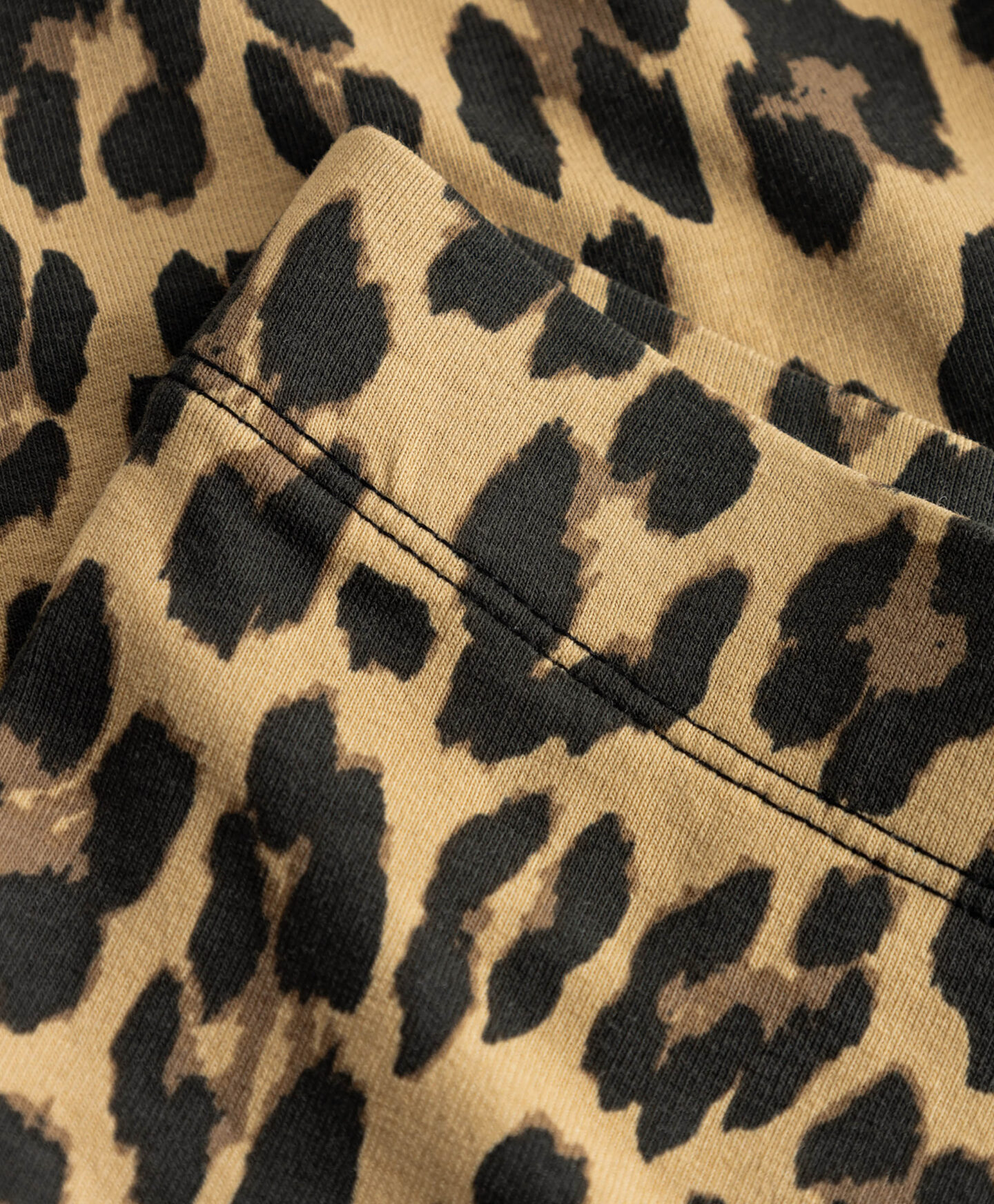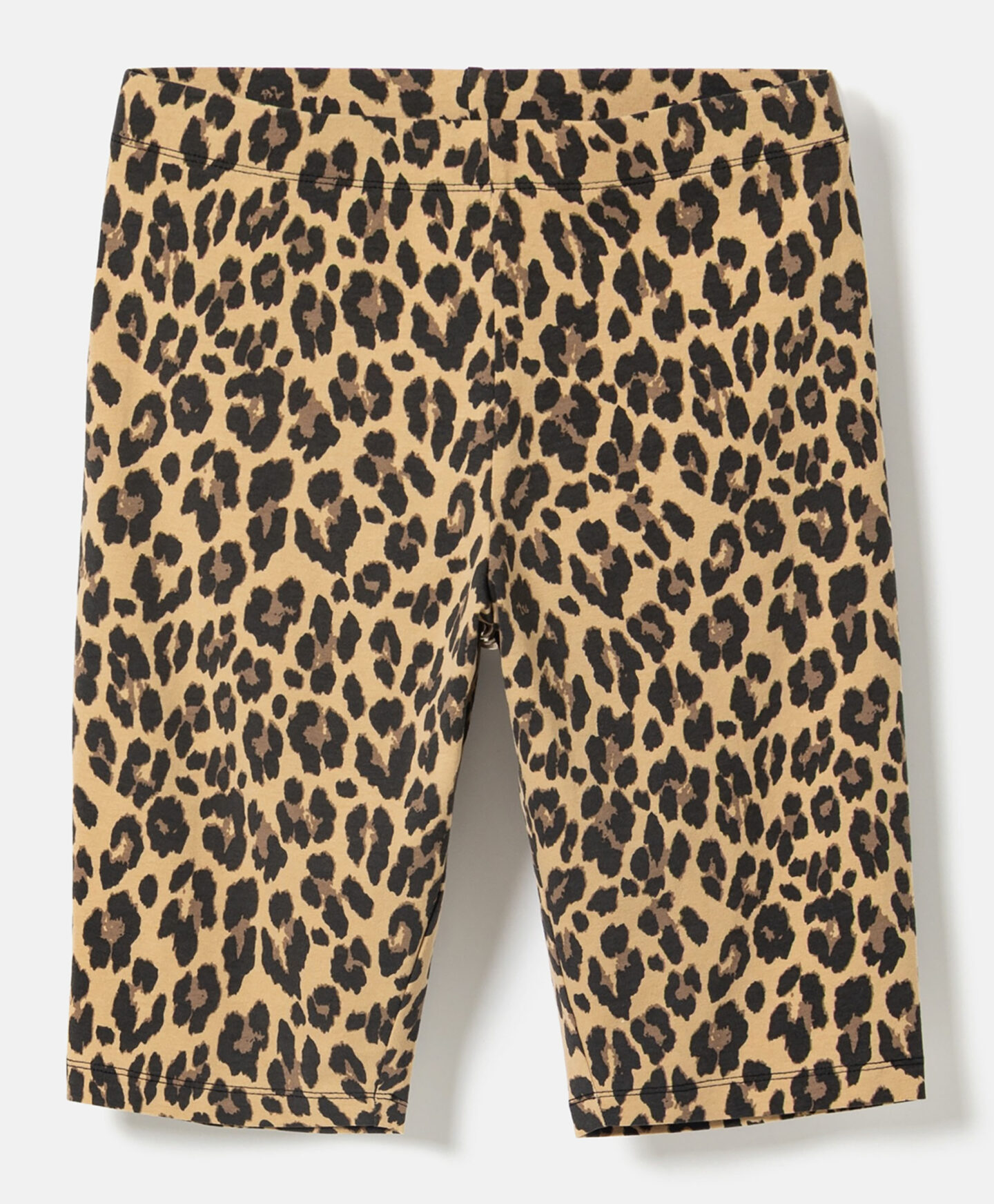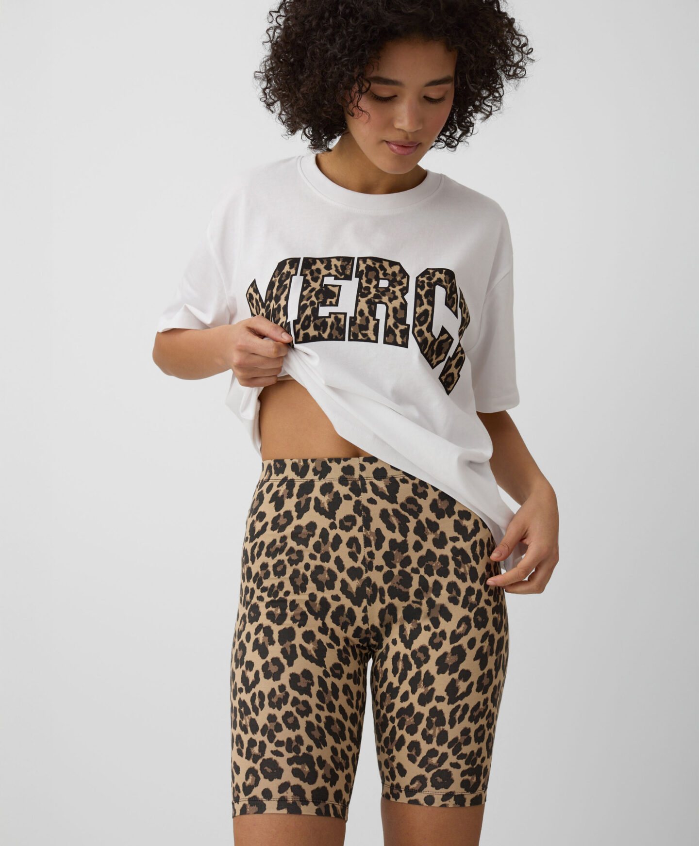 Този къс клин за колоездене с леопардов принт, изработен с високо съдържание на памук, е идеален за жени, които обичат да експериментират със стил и да изразяват своята индивидуалност чрез модата. Нотка еластан осигурява удобно прилягане. Вталената кройка оформя фигурата, а високата талия визуално удължава краката, осигурявайки максимален комфорт и свобода на движение. Комбинирай го с оувърсайз тениска или суитшърт за модерен, спортен вид.