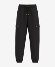 Черните дамски панталони са задължителна част от гардероба на всяка жена, която цени комфорта. Удобната кройка гарантира, че панталоните не ограничават движенията и осигуряват пълна свобода. Еластичната талия с практични връзки гарантира правилно прилягане към силуета. Декоративните капаци отстрани на крачолите придават характер на панталоните. Панталоните са изработени от плътна материя тип „скуба“, което ги прави еластични, меки и гладки. Чудесни са за разходка или каране на колело. Офертата включва и суитшърт, който образува комплект с панталона.