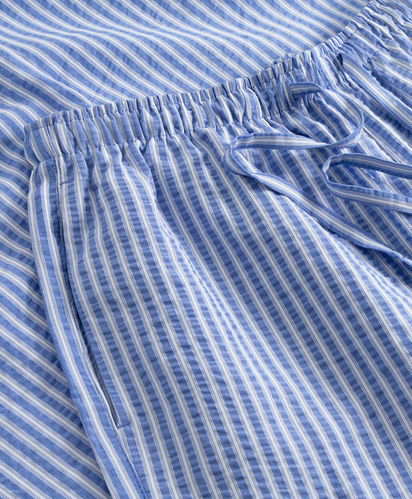 Дамските раирани панталони са пролетен хит. Широките крачоли осигуряват дишане и лекота. Широката еластична талия гарантира комфорт при носене, елиминирайки натиска върху стомаха. Връзките в талията осигуряват перфектно прилягане. Панталонът ще се допълва добре с бяла тениска или по-елегантна риза. В офертата се предлага и раирана риза, която създава комплект с панталона.