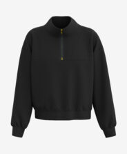 Черният дамски суитшърт е задължителен елемент в гардероба на всяка жена, която цени комфорта. Удобната кройка гарантира, че суитшъртът не ограничава движенията и осигурява пълна свобода. Практичният цип под врата гарантира правилна вентилация, а в по-хладните дни, когато е закопчан, създава уютна яка. Суитшъртът е идеален за разходка или каране на колело. Офертата включва и панталони, които образуват комплект със суитшърта.
