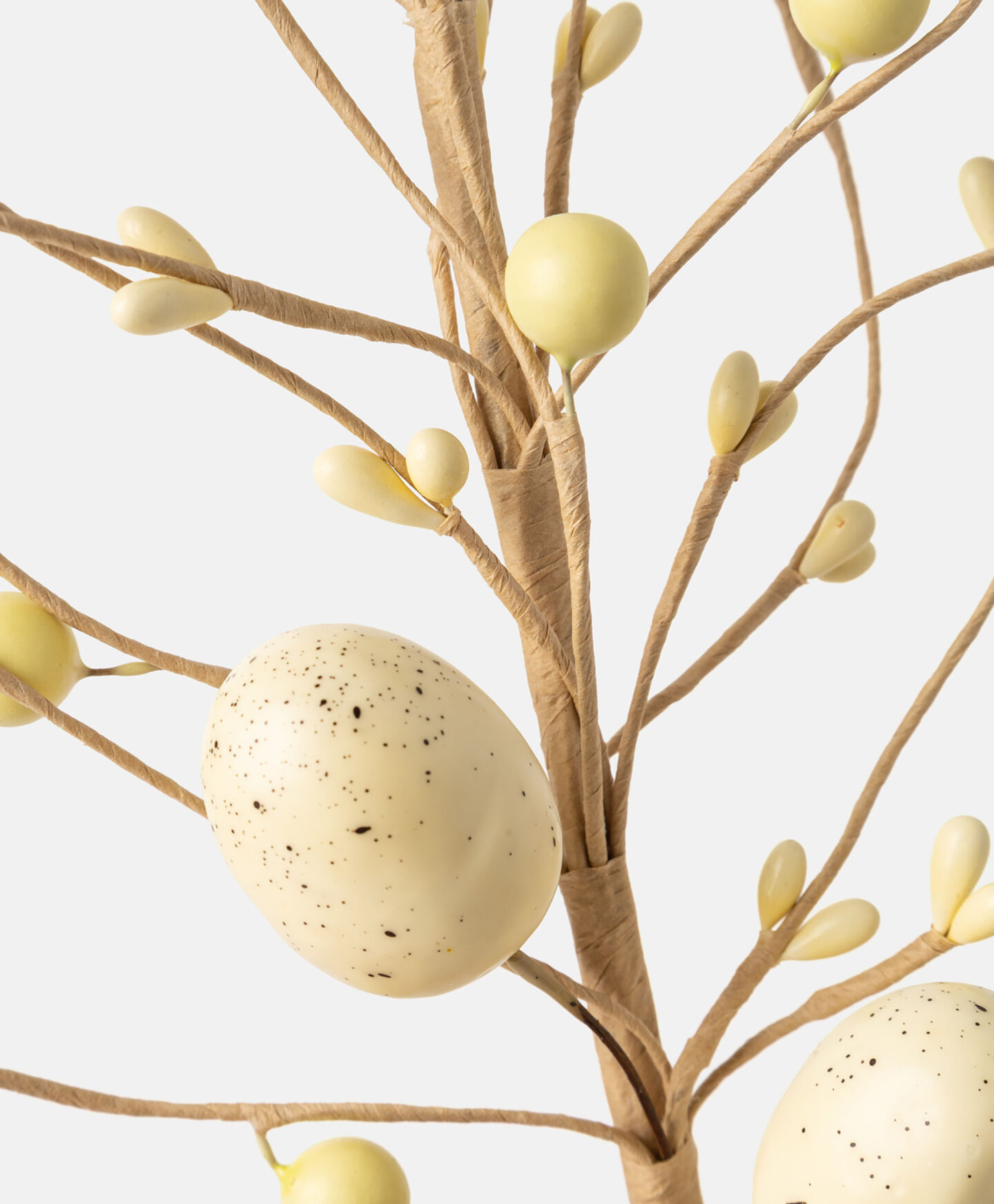 Тази декоративна жълта клонка с великденски яйца е идеалното решение за тези, които търсят готова, ефектна декорация. Можете да я използвате, за да създадете своя собствена централна украса или да я засадите в саксия, за да придадете на домашните си цветя великденски щрих. Тя е подходяща и като част от букет или самостоятелно аранжирана във ваза. Предлагат се два дизайна, от които да избирате.