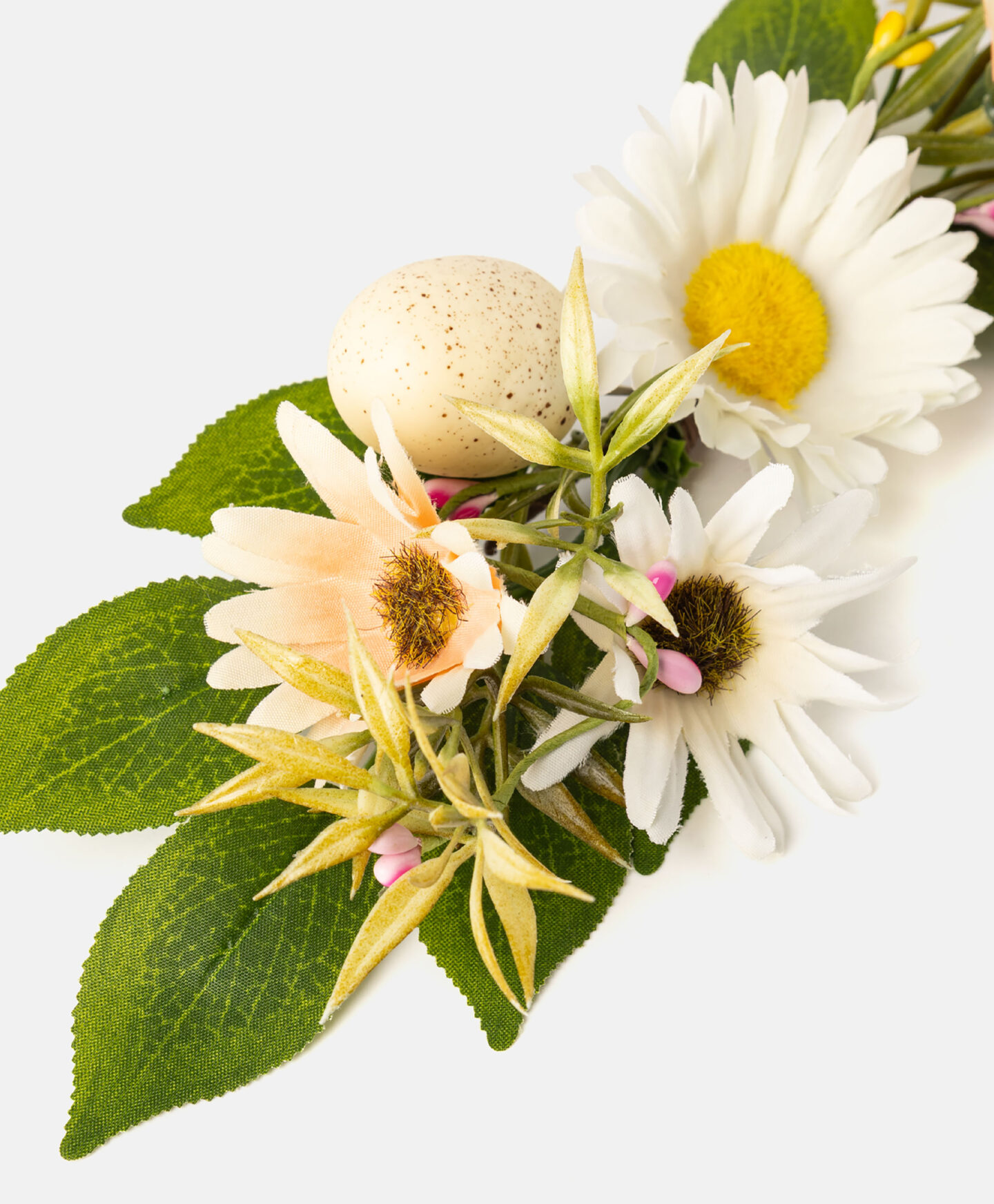 Декорацията за кошница в бяло е готова аранжировка, която можете да поставите на дръжката на вашата великденска кошница. Тя е лека, издръжлива и устойчива на атмосферни влияния. Това е перфектна алтернатива на свежите цветя, които може да не са налични по това време на годината. Предлага се в три различни дизайна.