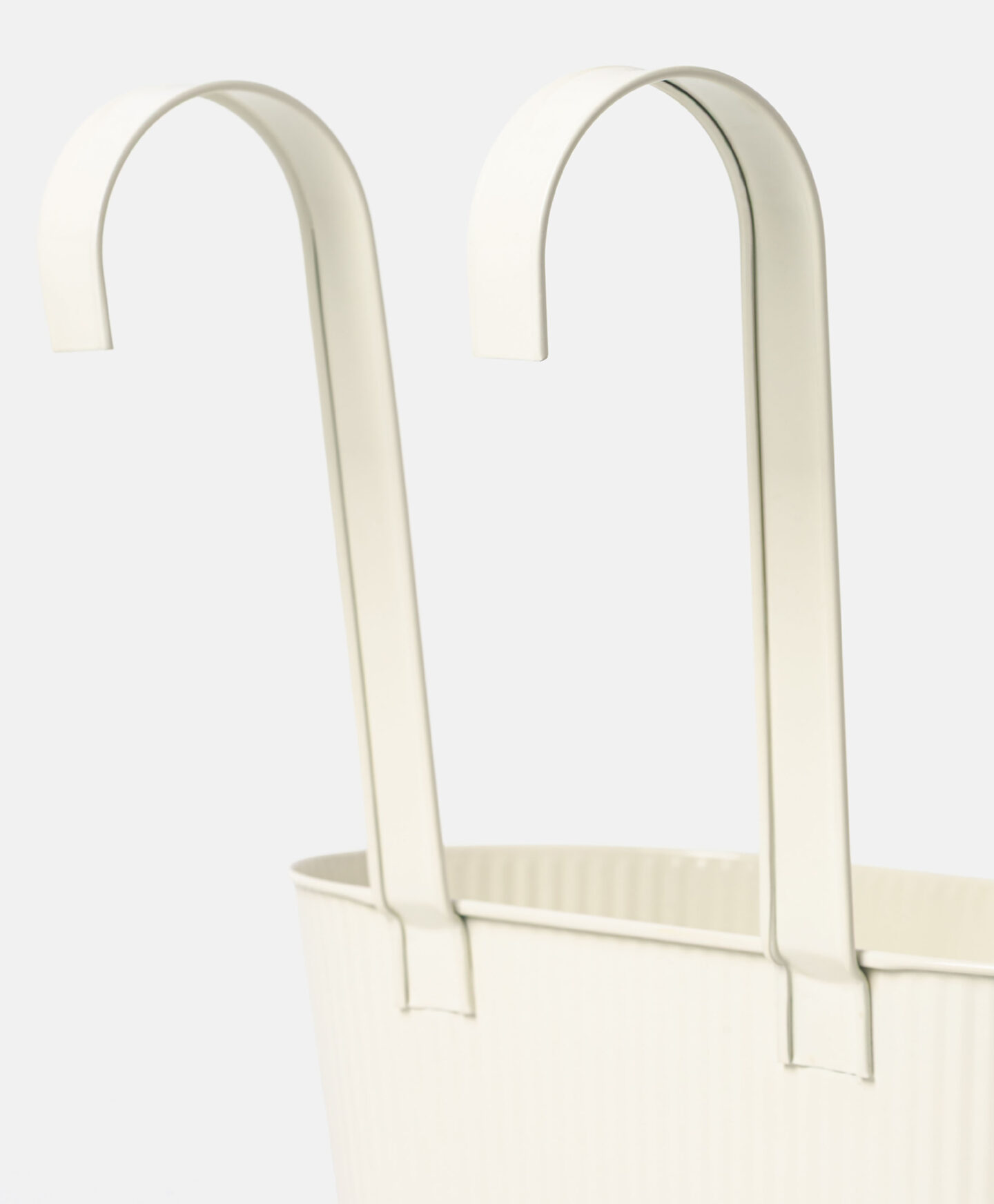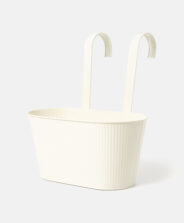 Удължена бяла кашпа за висяща саксия с оребрени стени привлича погледа с пролетния си дизайн. Практичните куки за окачване ти позволяват да го поставиш на парапет на балкон или дървена стена, като по този начин максимално използваш наличното пространство. Предлагат се различни модели.