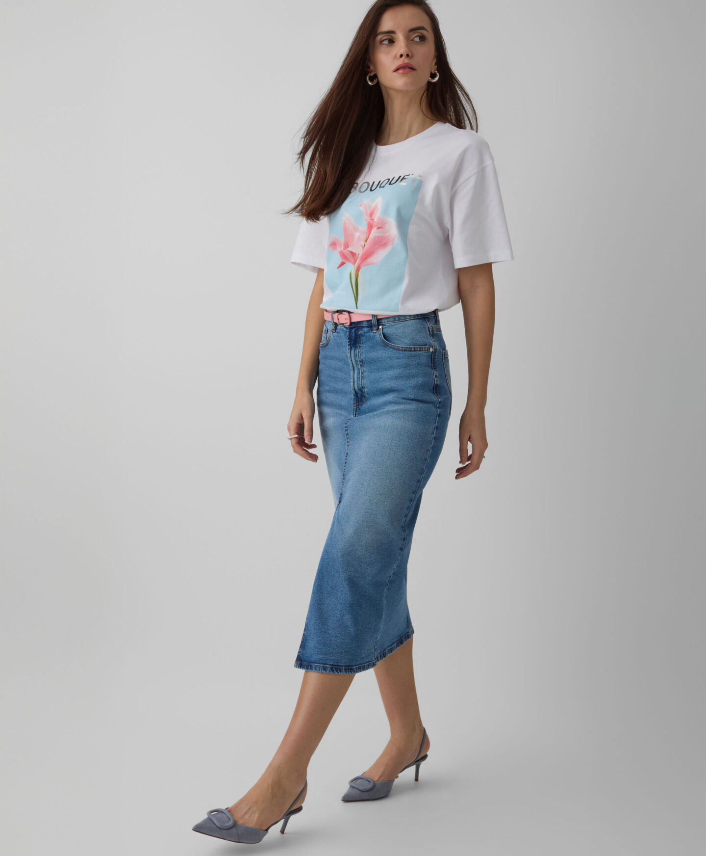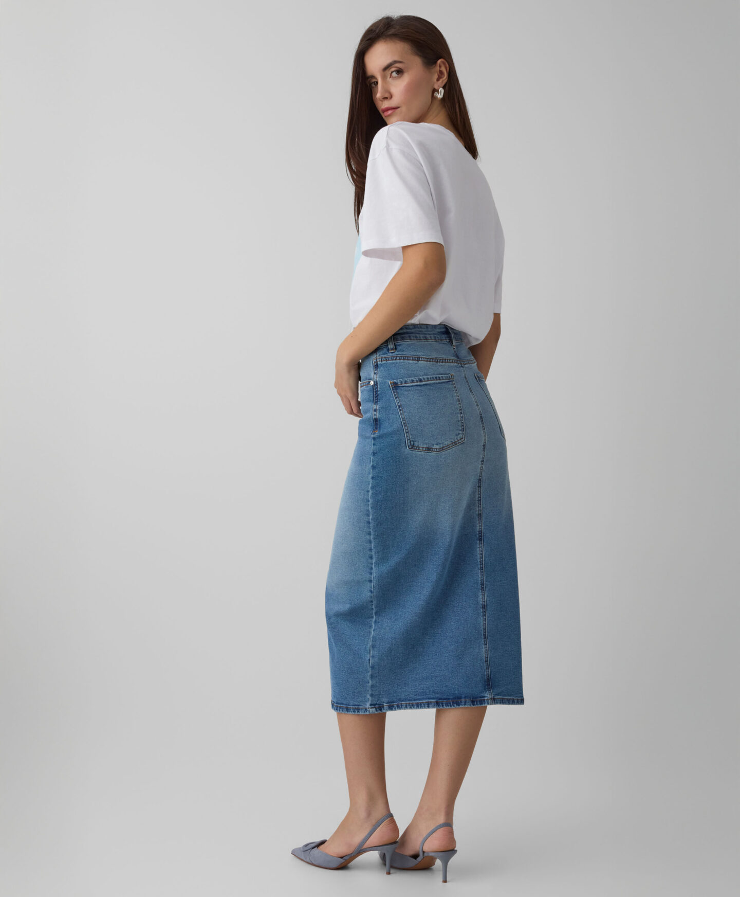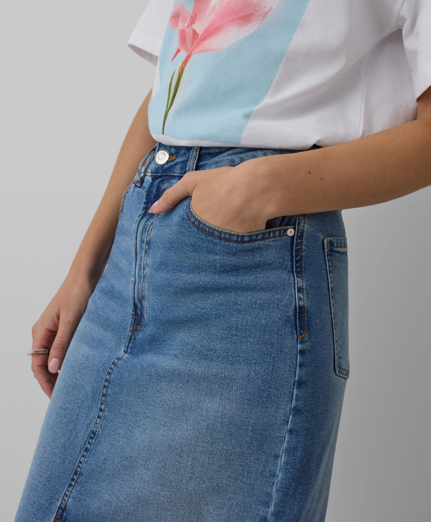 Дънкова пола с преден цепка изглежда красиво на фигурата. Вечният деним се съчетава добре както с класически тениски, така и с по-елегантни ризи. Той предлага същата свобода при избора на обувки – изберете маратонки за небрежен ефект или обувки на висок ток за стилна визия. Дължината миди прави полата подходяща за всеки повод.
