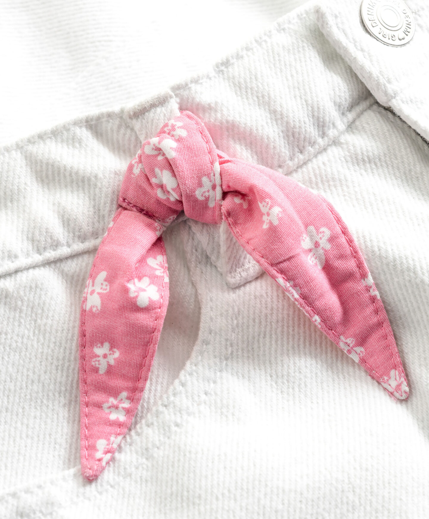 Дънкови къси панталони за момичета от 100% памук са най-модерната визия на лятото! Снежнобелият деним е класика, която лесно се комбинира с други цветове и шарки. Универсалната кройка на късите панталони осигурява комфорт при носене по време на летни приключения, а лентата с копчета на талията позволява перфектно прилягане. Розов шал е стилен аксесоар, който може да се завърже на панделка. Изглеждат красиво с раирани тениски или бродирани такива.