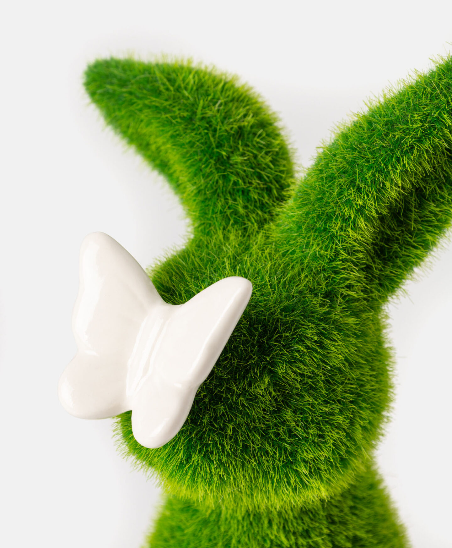 Зайчето покрито с пух държащо пеперуда е очарователна декорация, която изглежда чудесно свежо. Зеленият му цвят внася нотка пролет във всеки интериор. То лесно ще украси празнична маса, великденска централна украса или кухненски плот, добавяйки топлина към моментите, прекарани у дома. Предлагат се различни дизайни.