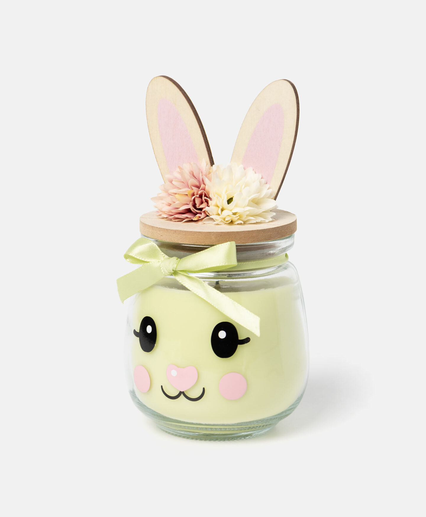 Зелената ароматна свещ в стъкло е с декоративен капак с 3D уши. Вдъхновеният от зайче дизайн ѝ придава много очарователен вид, който със сигурност ще се хареса на най-малките членове на семейството. Предлага дълго време на горене и красив аромат. Предлага се в три дизайна.