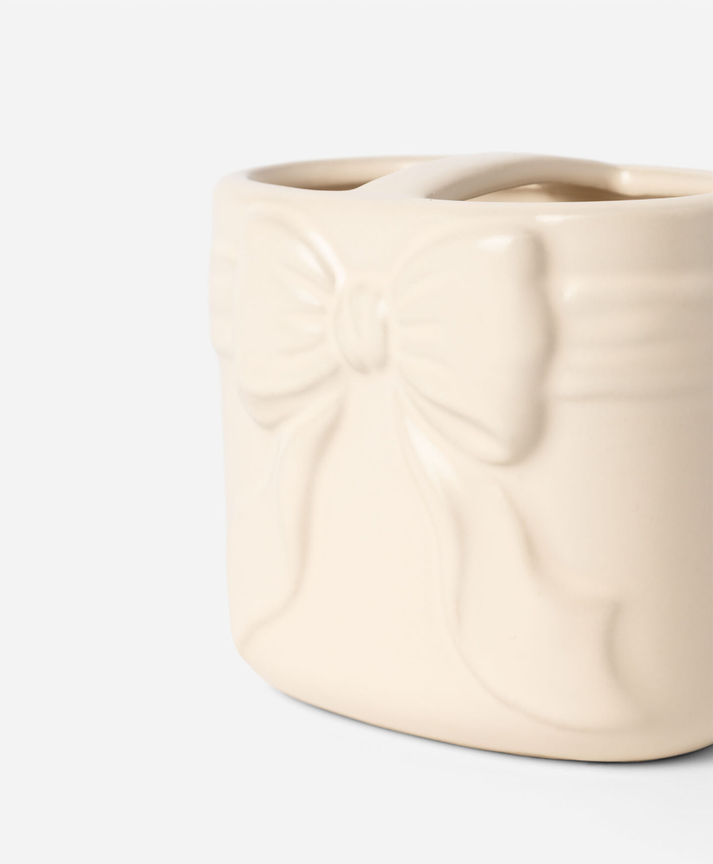 Керамичната поставка за четка за зъби с панделка има две просторни отделения и естетично покритие. Мотивът с панделка се съчетава перфектно с другите аксесоари за баня от колекцията. Изработена от керамика, поставката е издръжлива, устойчива на ежедневна употреба и лесна за почистване.