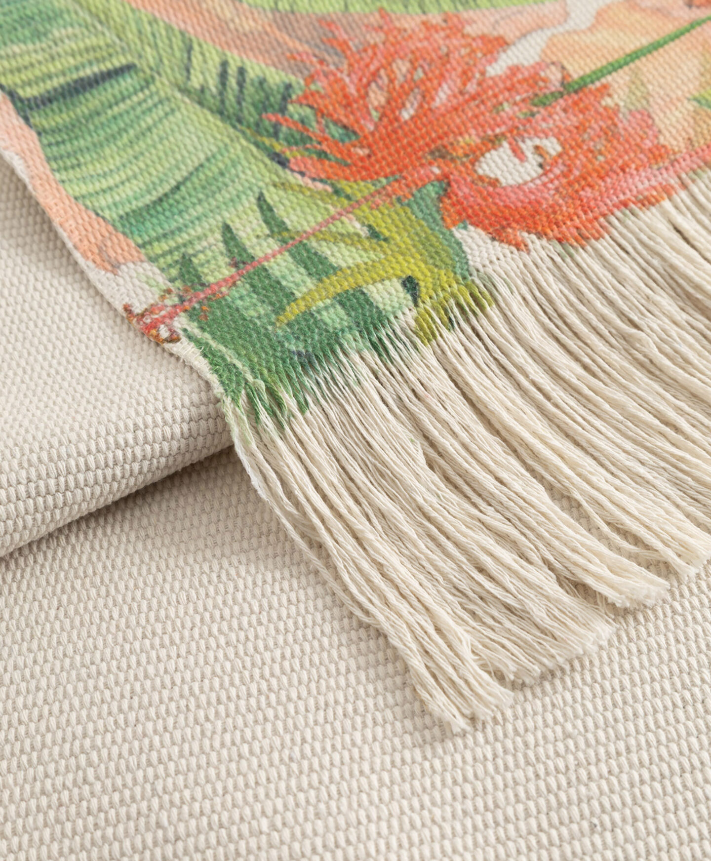 Килим с ресни с мотив от хибискус ще добави екзотичен чар към твоя интериор. Пищната зеленина и пъстрите цветя ще оживят както хола, така и коридора. Килимът би изглеждал страхотно и на пода в спалня или детска стая. Ресните му придават леко и рустик усещане. Той е издръжлив, устойчив на ежедневно износване и лесен за почистване.