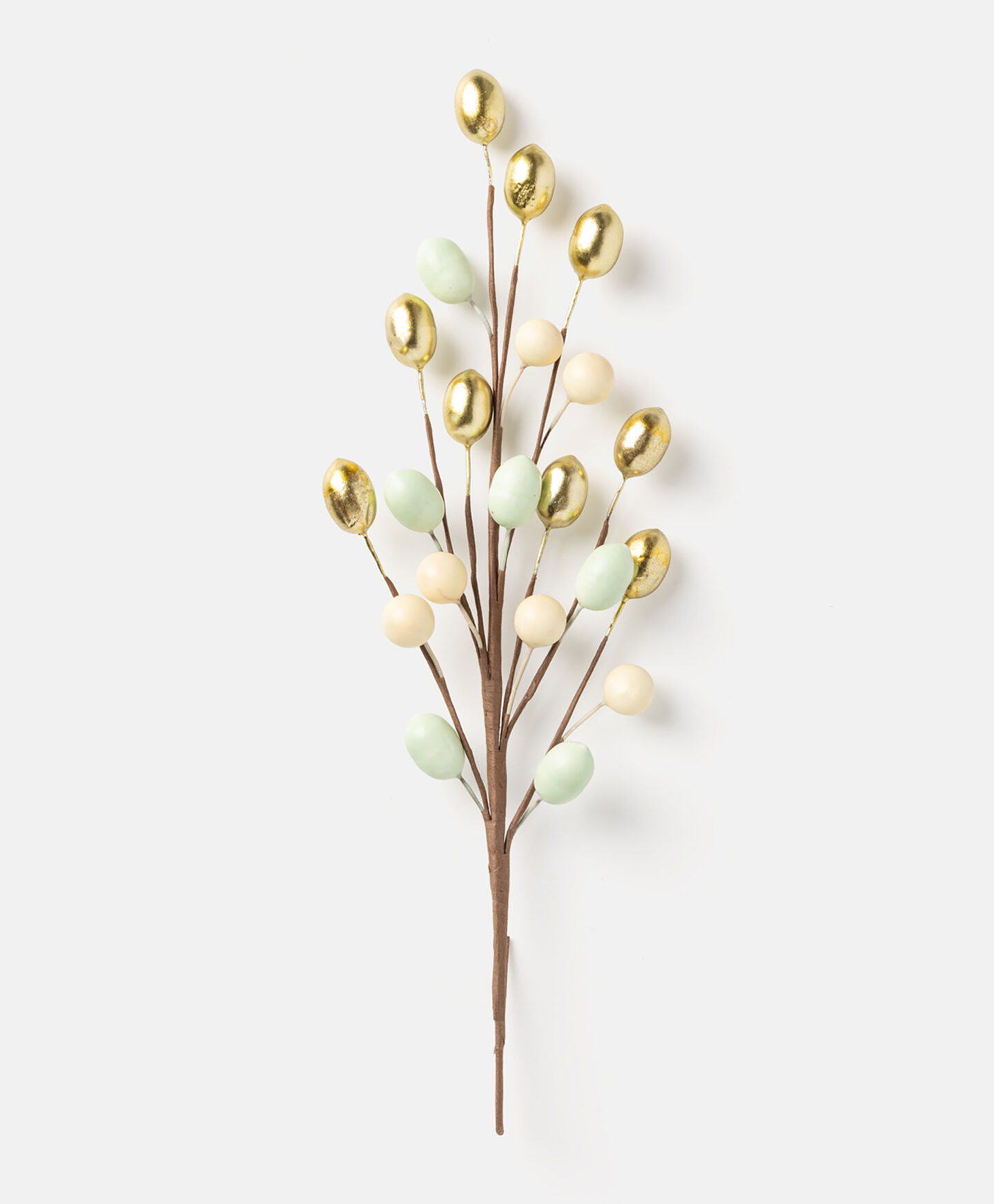 Клонче със златни великденски яйца ще създаде великденска атмосфера във всеки интериор. То е подходящо както за елемент от кошница, така и за празнична украса на маса. Поставете го в саксия или го аранжирайте небрежно върху покривка за маса, за да радва окото по време на великденска закуска.