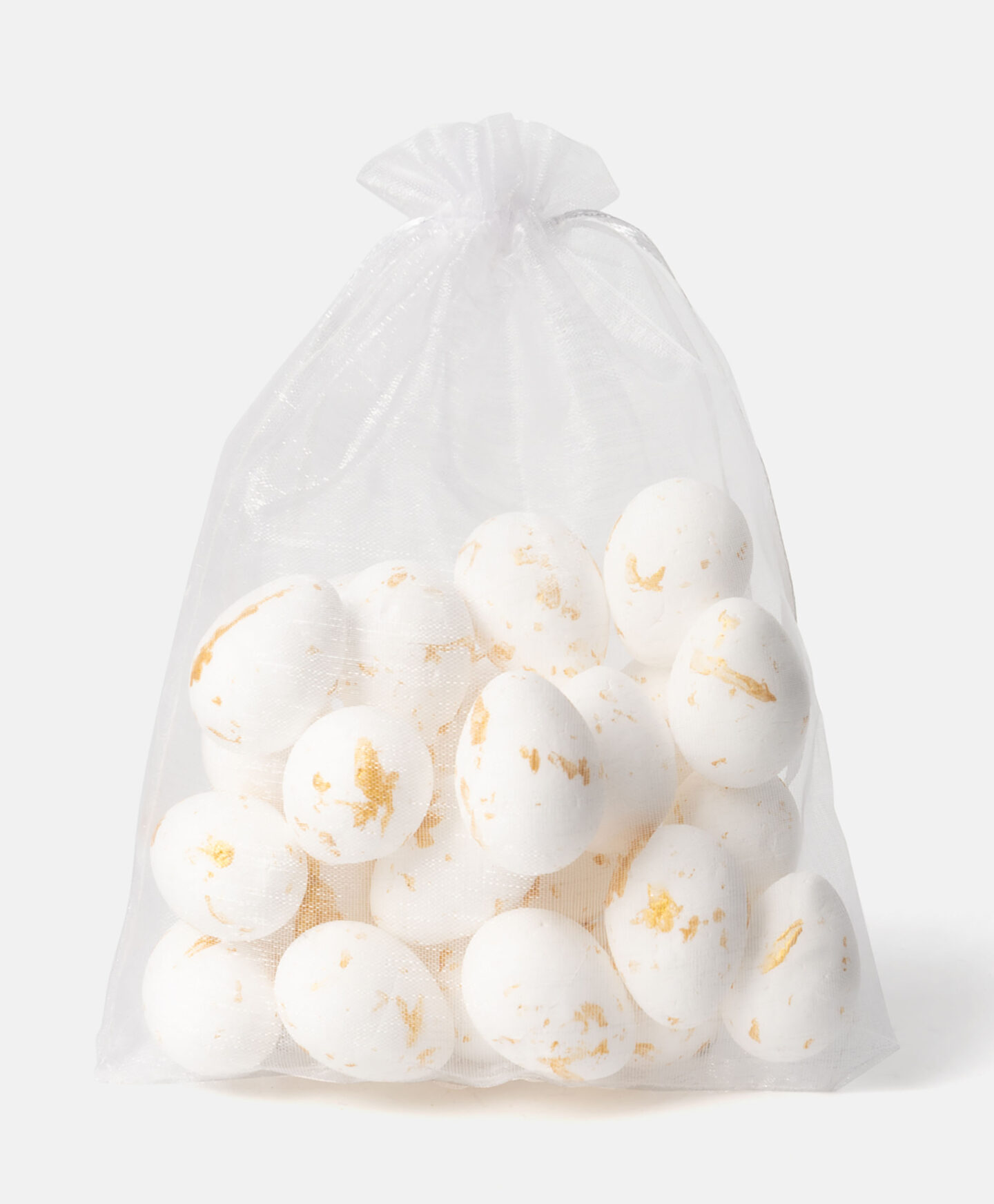 Този комплект бели стиропорени яйца в пликче с размер 3,5 см съдържа 25 леки, пъстри великденски яйца, които ще ви позволят да завършите разнообразни „Направи си сам“ проекти. Те са идеални за декорация на маса, поставени сред прибори за хранене или като част от великденска централна украса. Можете също да ги поставите в саксии за цветя, кошници с великденски декорации или да ги използвате по време на търсене на великденски яйца, включващо най-малките членове на семейството. Предлагат се различни дизайни.