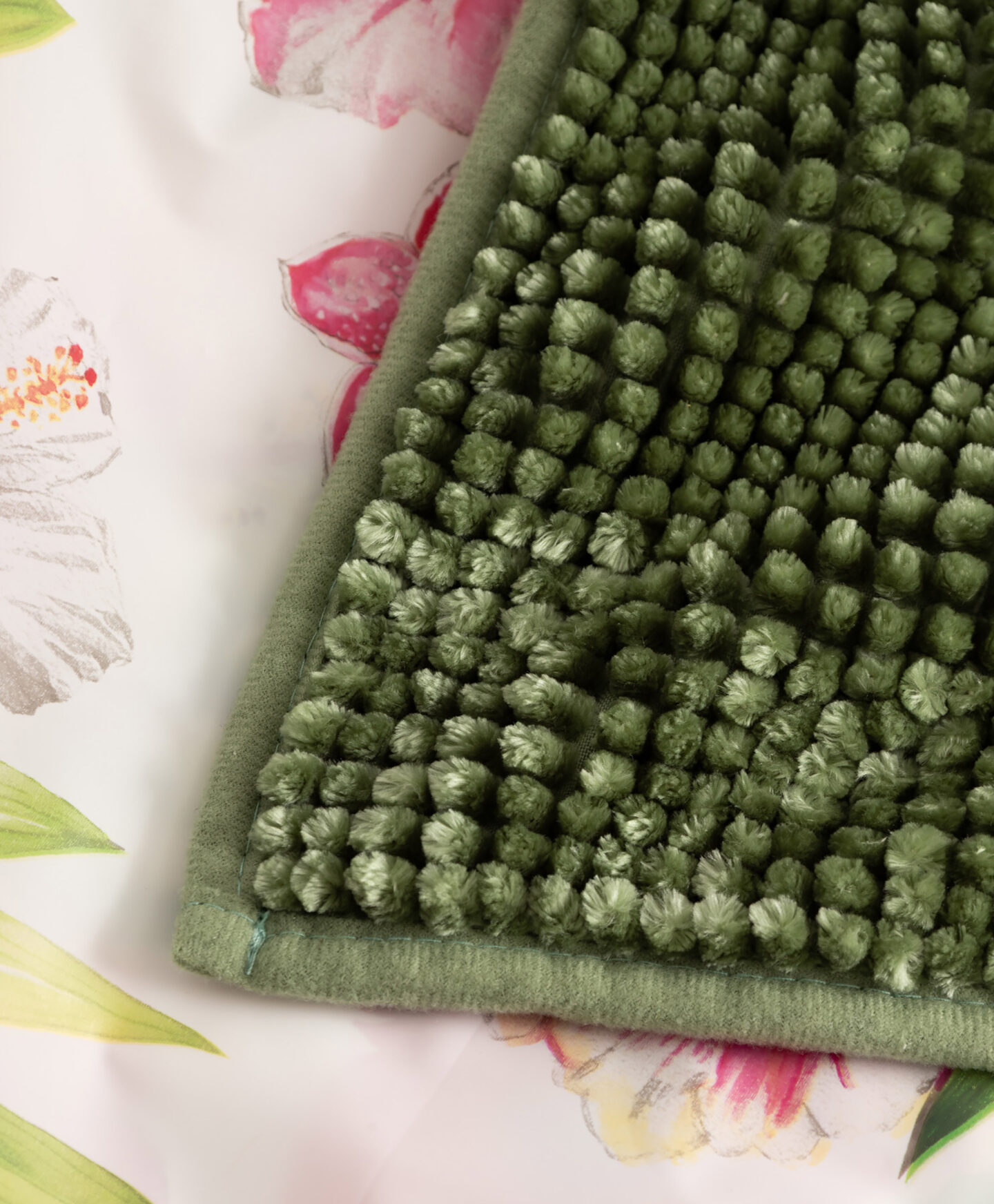 Този комплект за баня е бърз начин да освежиш банята си и да създадеш релаксиращо пространство. Зеленият цвят на постелката и завесата с шарка на хибискус организират пространството и му придават модерно ботаническо или градско джунгла усещане. Изработена от водоустойчив, бързосъхнещ материал, завесата ефективно предпазва банята от пръски. Меката, пухкава постелка е невероятно приятна на допир.