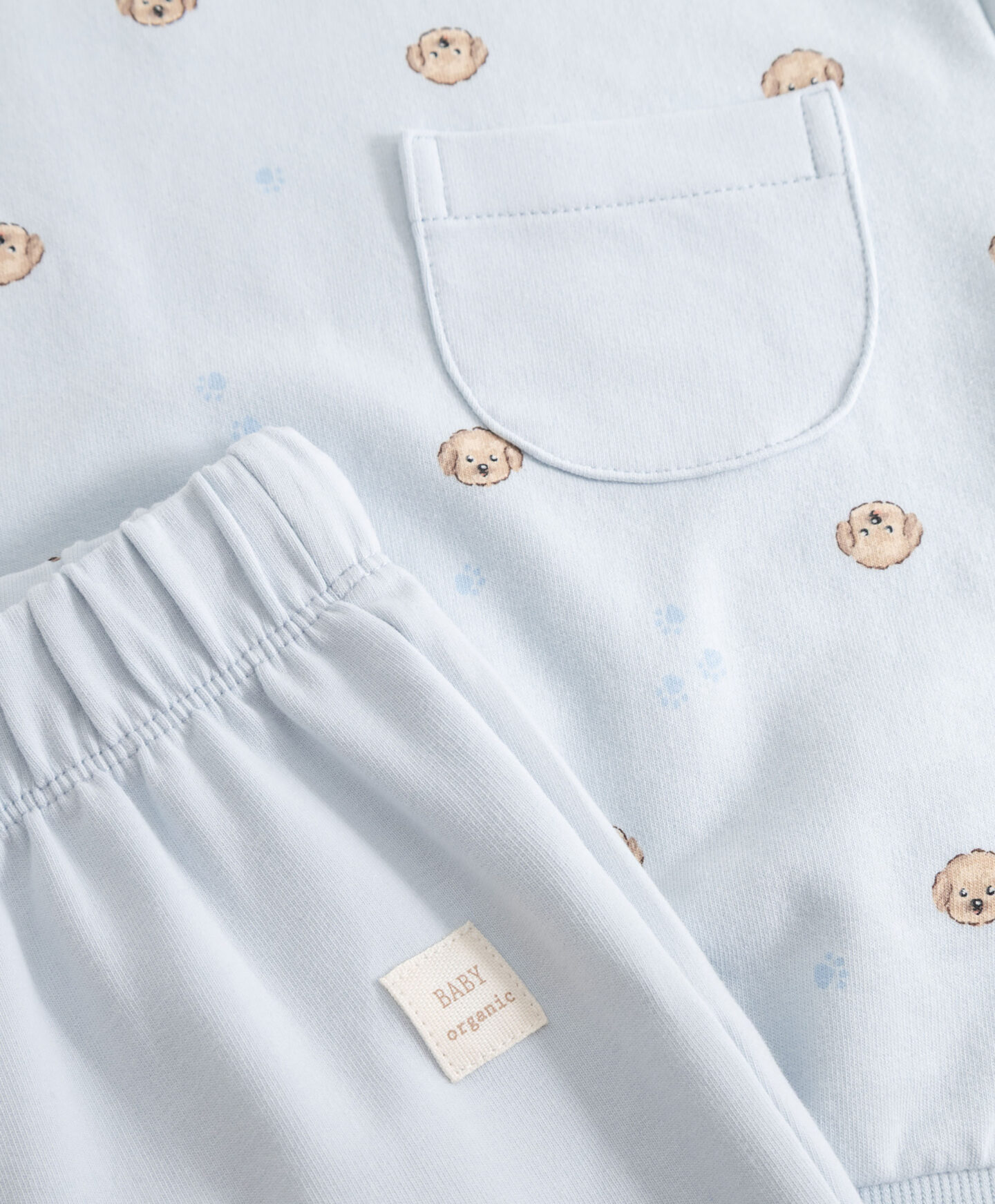 Комплектът за бебе момче включва панталон и суитшърт с шарка на куче. Нежният му син цвят ще допълни перфектно гардероба на вашето бебе. Както суитшъртът, така и панталонът са завършени с еластични маншети, осигуряващи топлина и комфорт за вашето мъниче. Мекият материал с високо съдържание на памук е идеален за носене от първите дни от живота му.