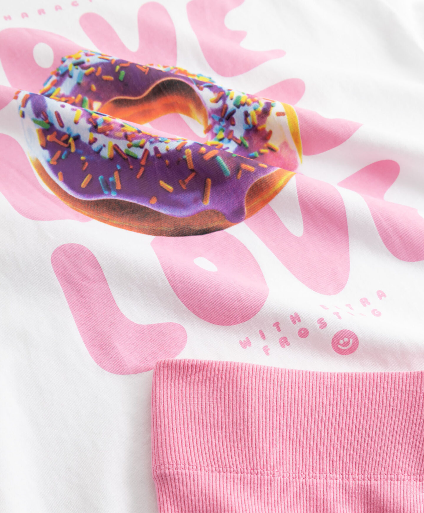 Комплектът за момичета с понички се състои от тениска и велосипедни къси панталони. Тениската е изработена от мек памучен материал, който е приятен на допир, а графиката с понички отпред привлича погледа и я отличава от останалите. Клинът с високо съдържание на памук е еластичен и приляга красиво по фигурата, без да ограничава движението и играта. Предлагат се различни модели.