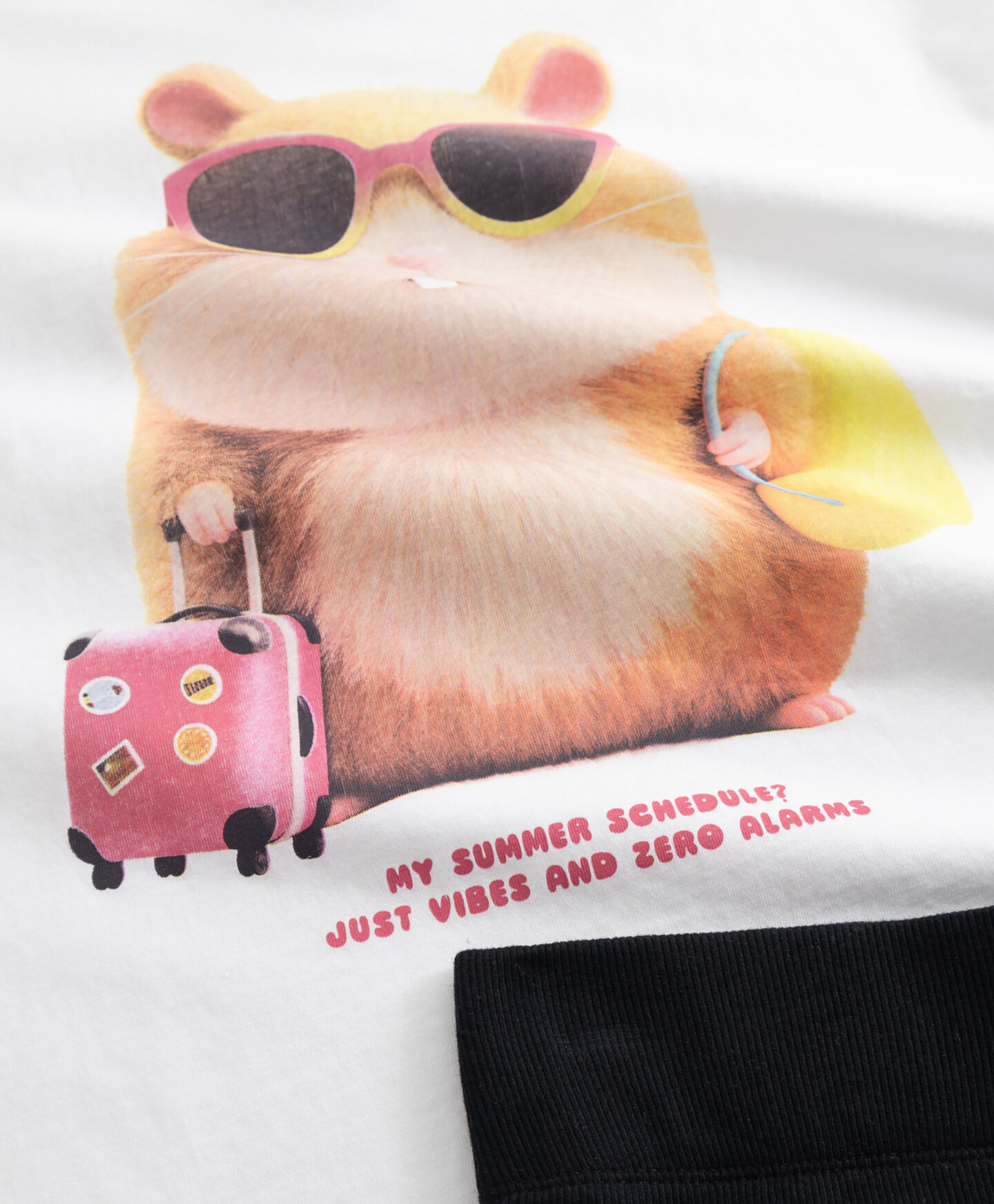 Комплектът за момичета с хамстери се състои от тениска и велосипедни къси панталони. Тениската е изработена от мек памучен материал, който е приятен на допир, а забавната графика с хамстери отпред ще плени сърцето на всеки малък любител на тези очарователни създания. Клинът с високо съдържание на памук е еластичен и приляга красиво по фигурата, без да ограничава движението и играта. Предлагат се различни модели.