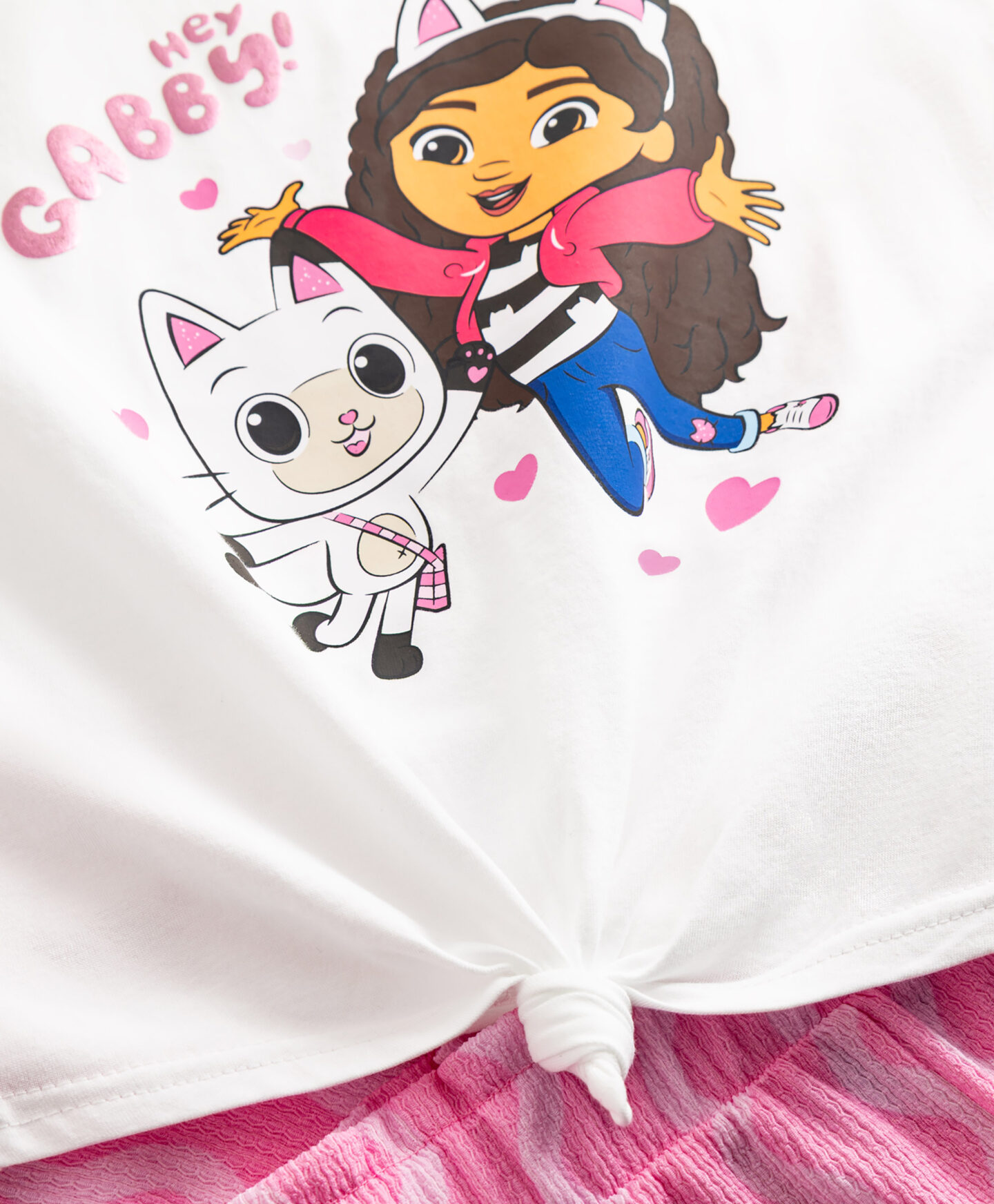 Комплектът за момичета Gabby’s Dollhouse е модерно предложение, което ще се хареса на младите любители на стила. Тениската с вратовръзка и графика с любими герои привлича вниманието. Това е готова идея за стилизиране за детска градина, площадка или семейни разходки в красиви, слънчеви дни.