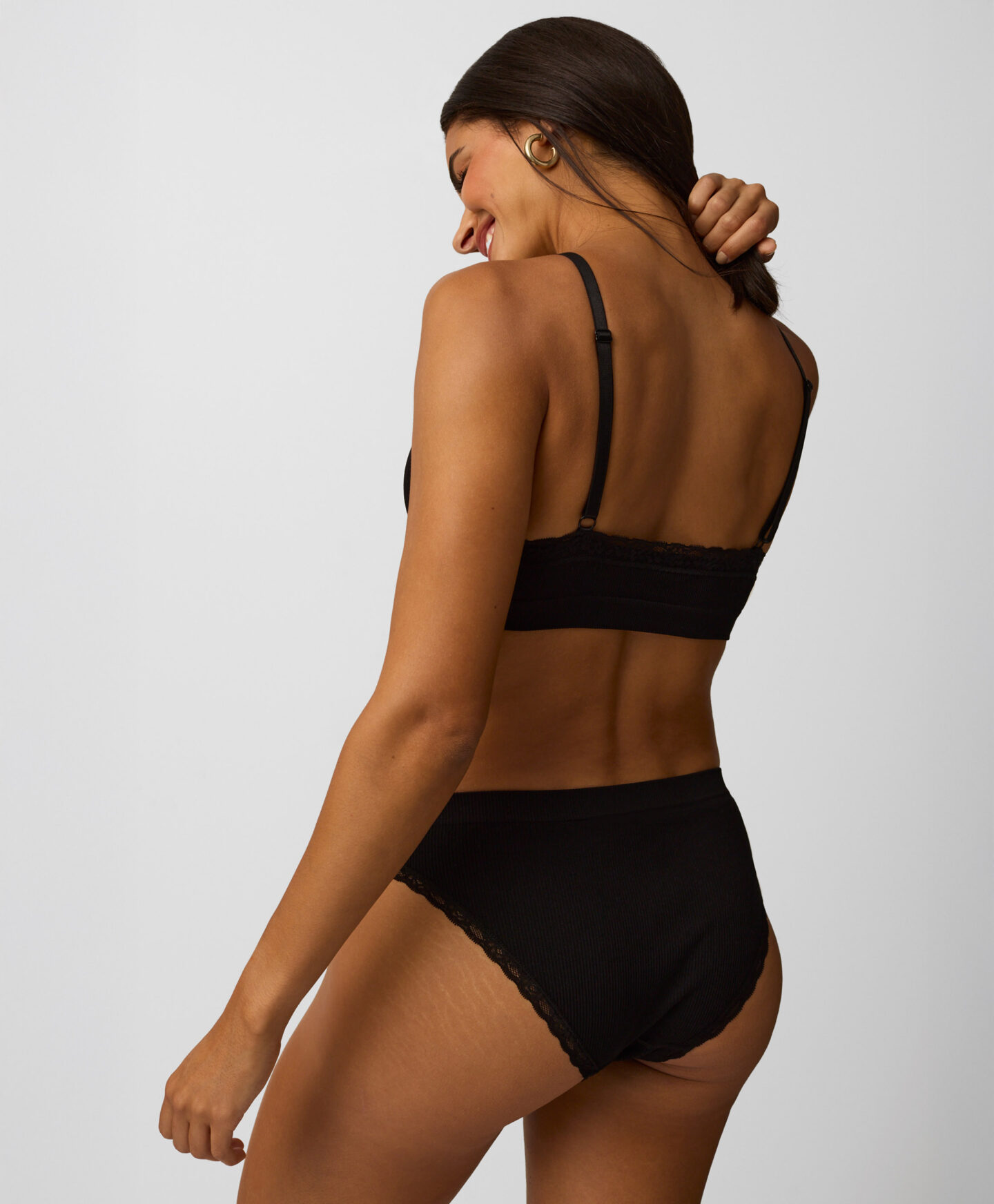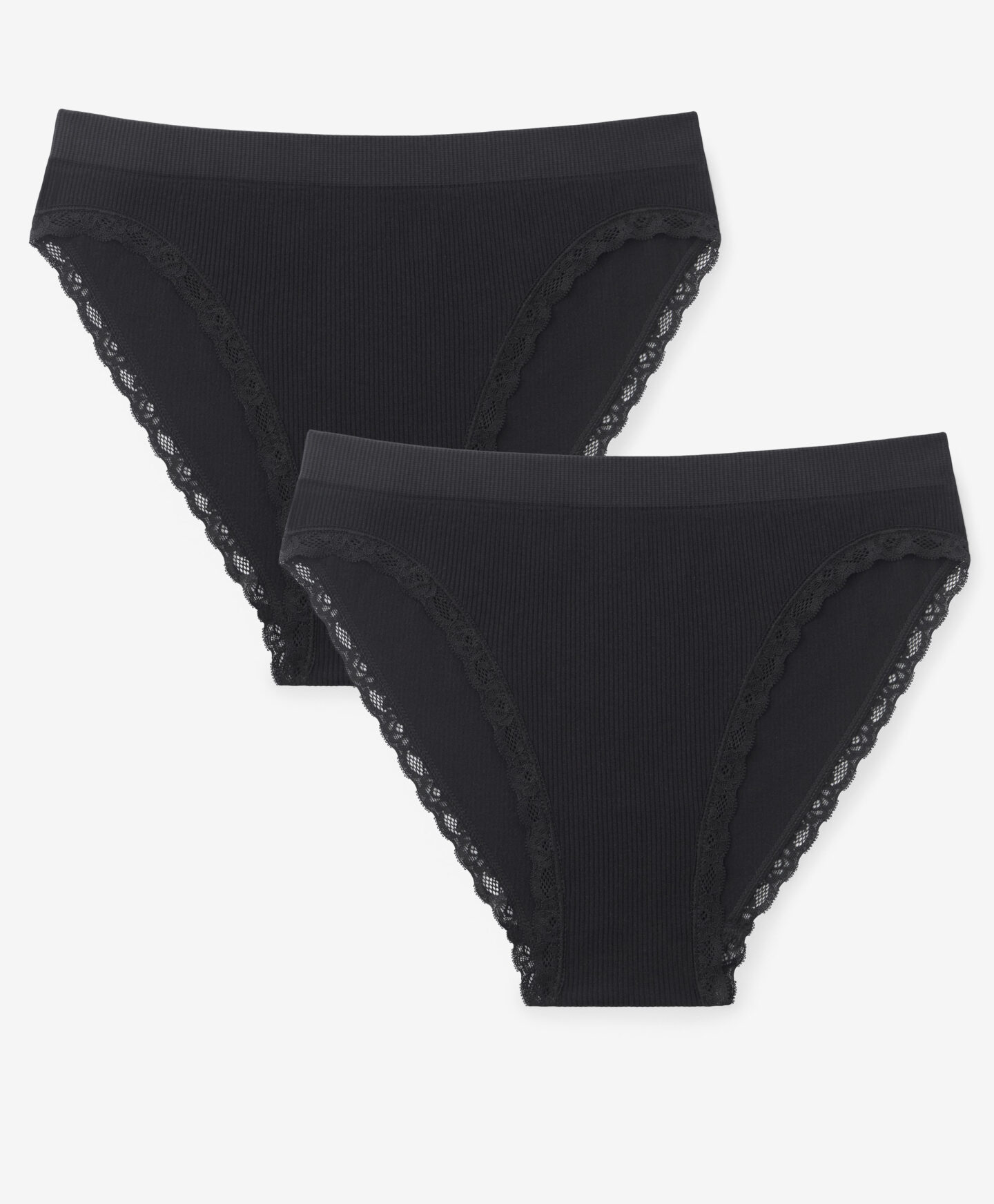 Комплектът от 2 бр. бикини с дантела в черно е идеален за любителите на романтично бельо. Чувствената дантела разпалва въображението, но е идеална и за ежедневно носене. Кройката осигурява пълно покритие и комфорт, като същевременно подчертава женствените извивки.