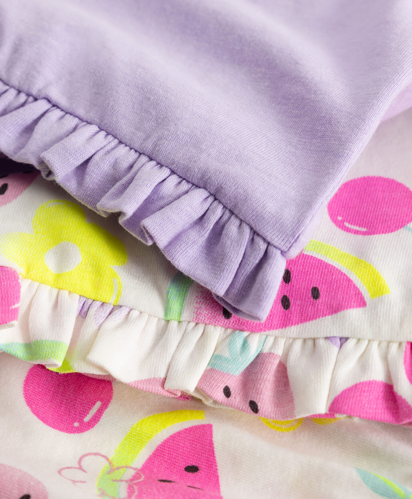 Този комплект от 2 цветни къси панталони за бебе с плодов принт е идеален за лятото! Едните са с весел, цветен плодов принт, а другите са в пастелен цвят. Нежните волани на крачолите добавят момичешки щрих. 100% памук гарантира, че бебешката кожа може да диша свободно.