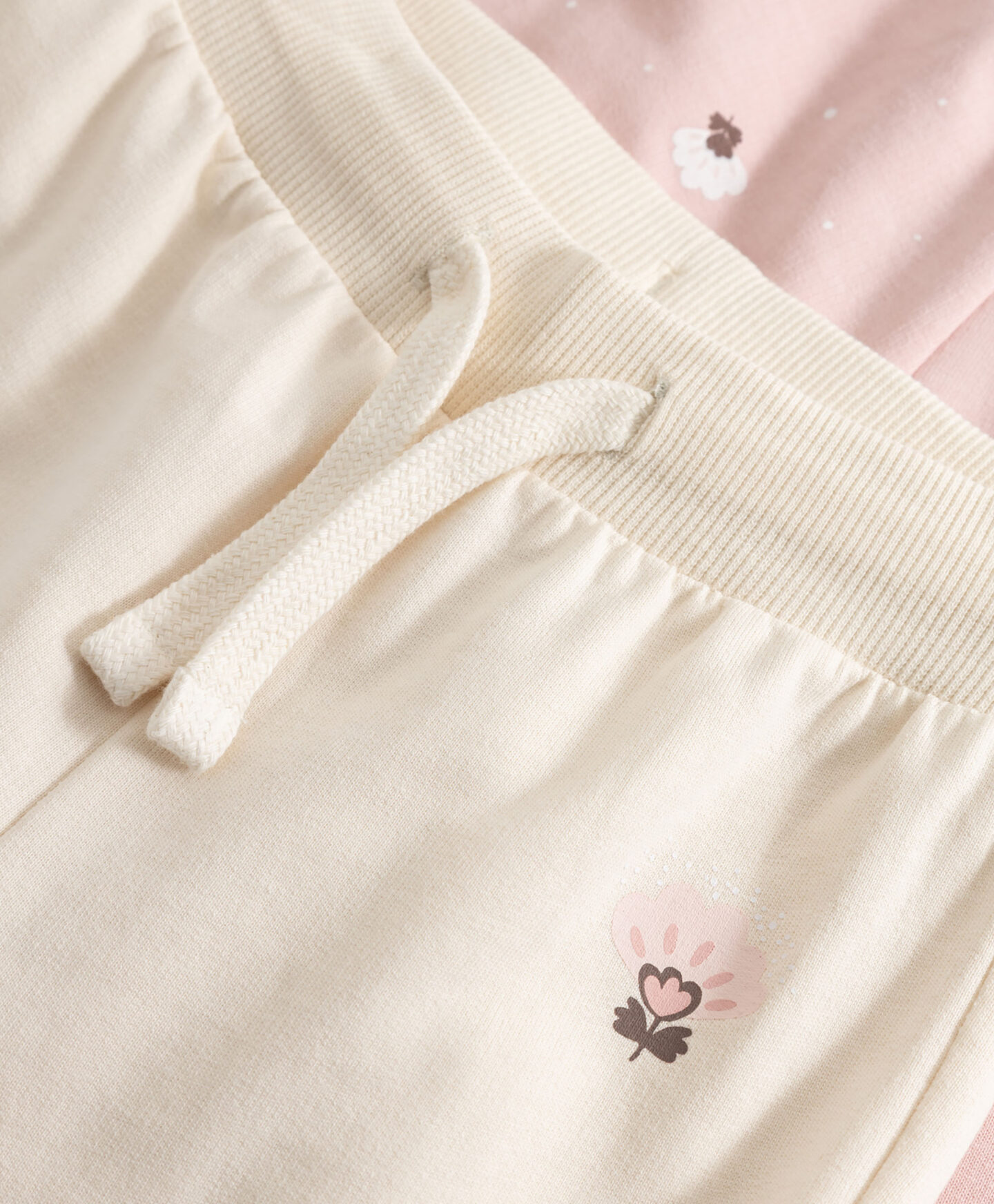 Комплектът от 2 спортни панталони за бебета момичета, изработени от 100% памук, е подходящ за деликатна кожа от първия ден. Всеки чифт се откроява в различен цвят, пасвайки идеално на пролетния климат. Ластичната талия с връзки позволява на панталоните да прилягат перфектно около малкото коремче. Еластичният маншет улеснява обличането на детето.