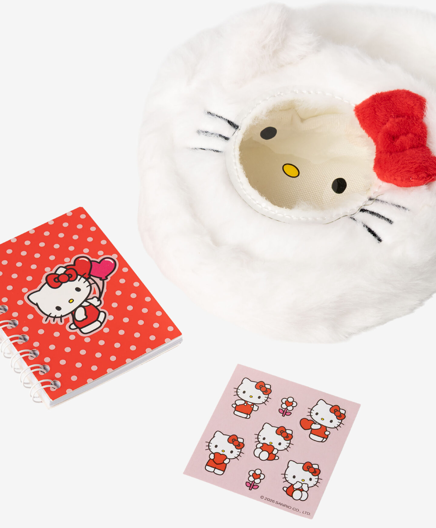 Комплектът Hello Kitty се състои от пухкав портфейл и тефтер със стикери. Този аксесоар със сигурност ще зарадва всеки фен на емблематичния герой. Сладък, компактен и готов за приключения! Портфейлът с дръжка е с характерната червена панделка – запазен знак на Hello Kitty.