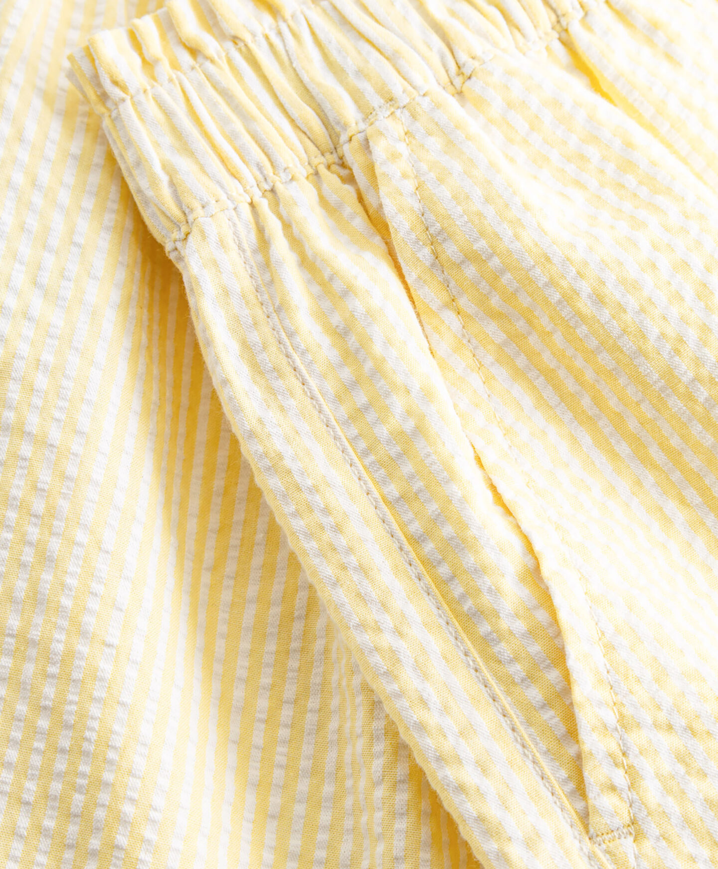Тези 100% памучни къси паталони за момиче са идеални за летни забавления. 100% памучният материал е мек, дишащ и перфектно отвежда влагата. Свободните крачоли позволяват неограничено движение при бягане, скачане или катерене по детската площадка. Фините бели и жълти райета придават на късите панталони уникален характер.