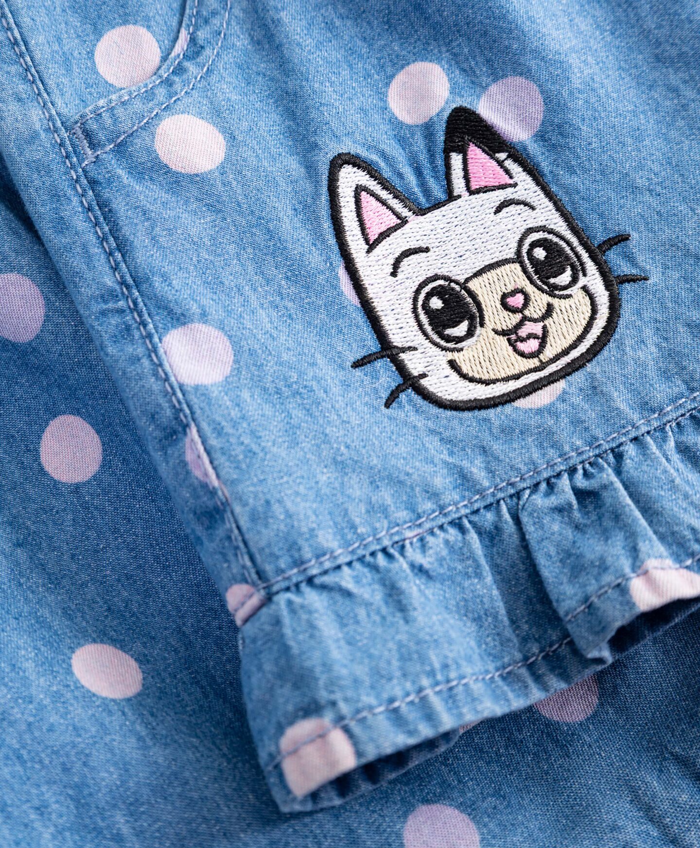 Къси панталони за момичета Gabby’s Dollhouse 100% памук с къдрици на крачолите имат удобни джобове и еластична талия. Моделът на точки им придава чар, а графиката с любимия ви анимационен герой ги отличава от другите дрехи. Това е отличен избор за детска градина, площадка за игра или семейни разходки.
