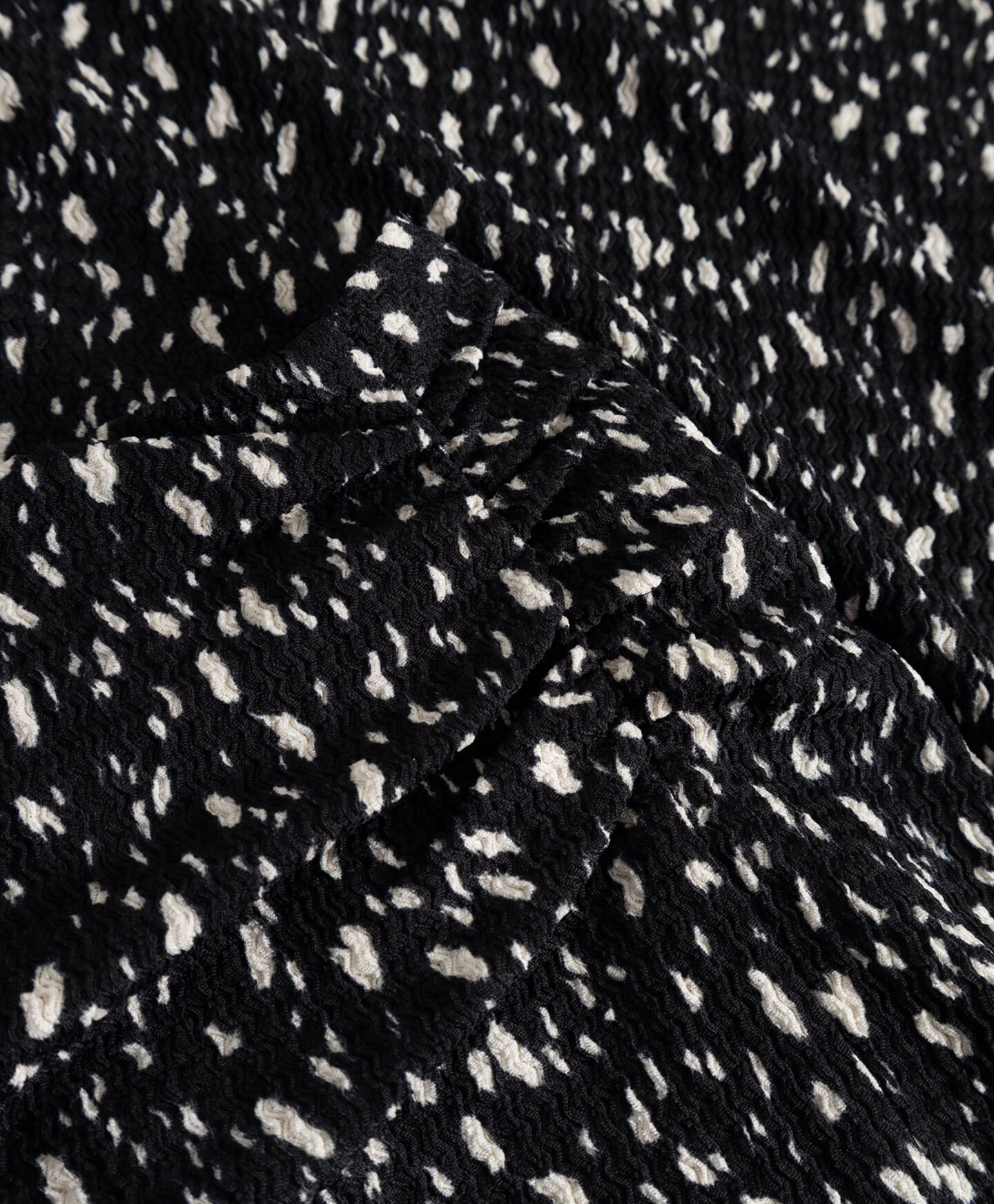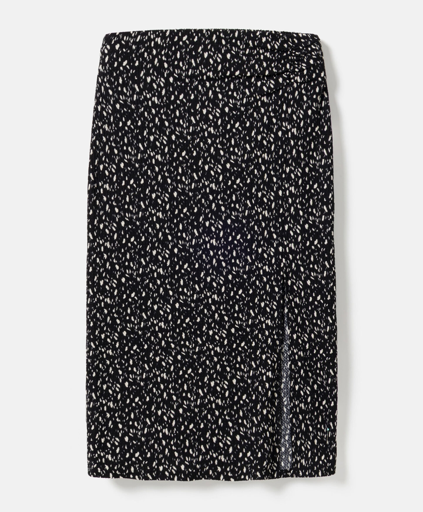 Намачкана пола с шарка създава комплект с риза с къс ръкав от колекцията. Неправилният шарка привлича погледа и прави полата да се откроява в гардероба ти. Цепката подчертава най-добрите ти черти и оптически удължава краката ти. Полата е лека, приятна на допир и устойчива на пране.