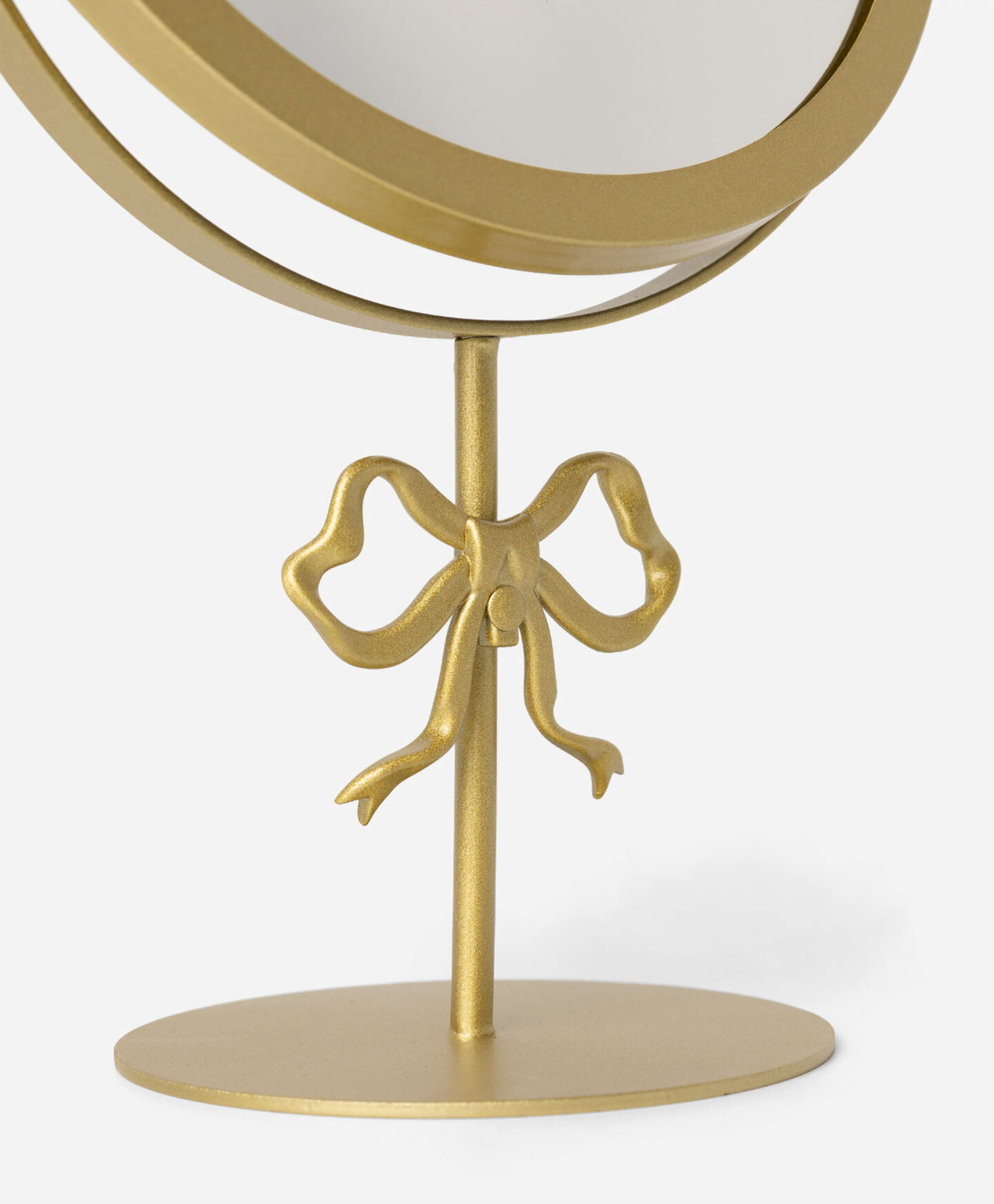 Настолното огледало с панделка е елегантен акцент, който ще добави уникален чар към вашия интериор. Златистото покритие хармонизира перфектно с декоративната панделка, създавайки стилен ефект. Идеално за спалня, баня или тоалетка, огледалото ще улесни ежедневните ритуали за грижа за външния вид.
