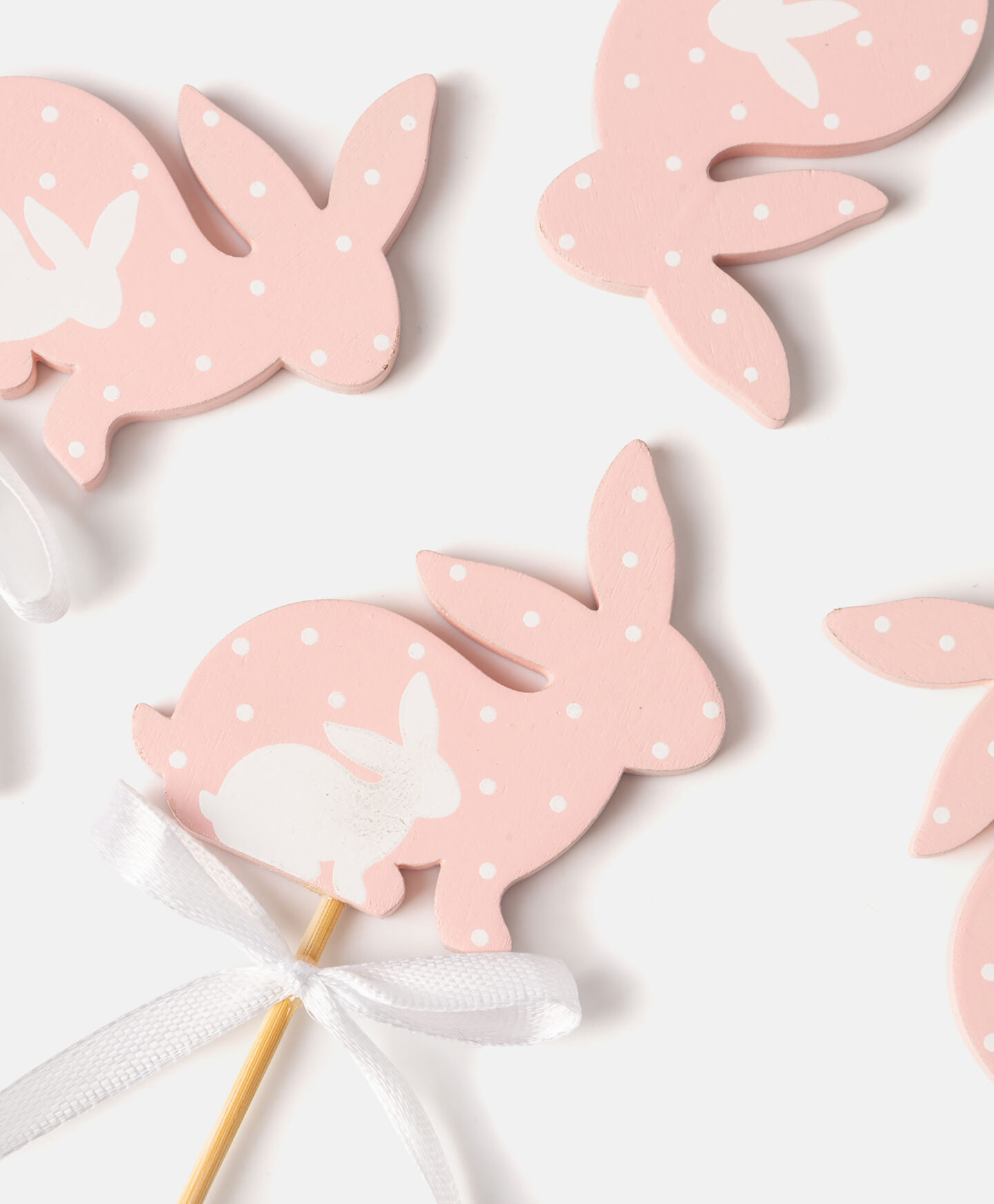 Този пакет от 4 декорации с фигурки зайчета и панделки е елегантна декорация, вдъхновена от великденските символи. Идеален за декориране на кошници, саксийни растения или букети. Предлага се в различни дизайни.