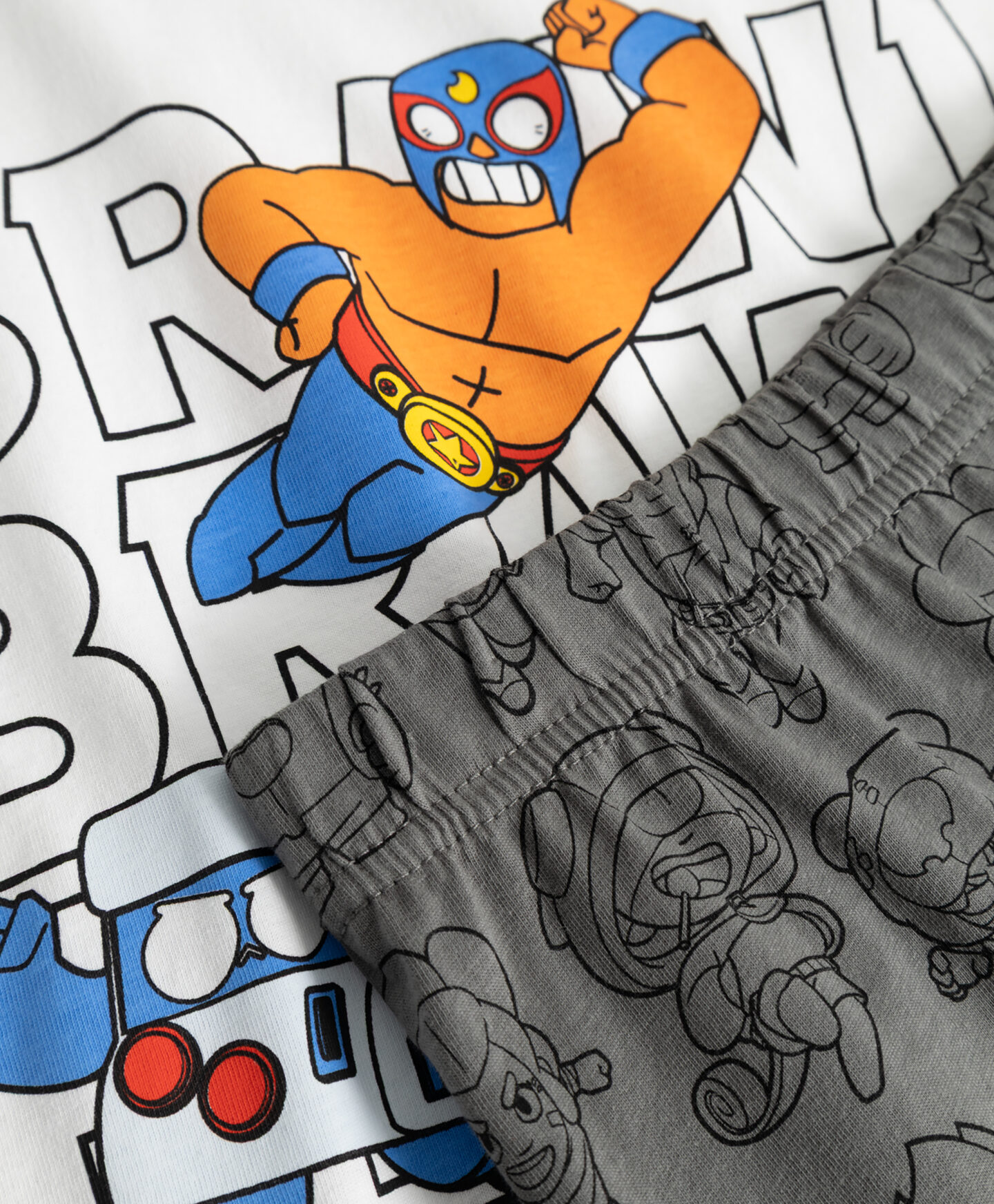 Пижамата за момчета Brawl Stars, изработена от 100% памук, е подходяща за феновете на емблематичната игра. Комплектът се състои от тениска и къси панталони, така че е чудесен за по-топлите нощи. Материята е приятна за кожата и нежно обгръща детето за сън, а класическата кройка гарантира свобода на движение. Предлагат се различни дизайни.