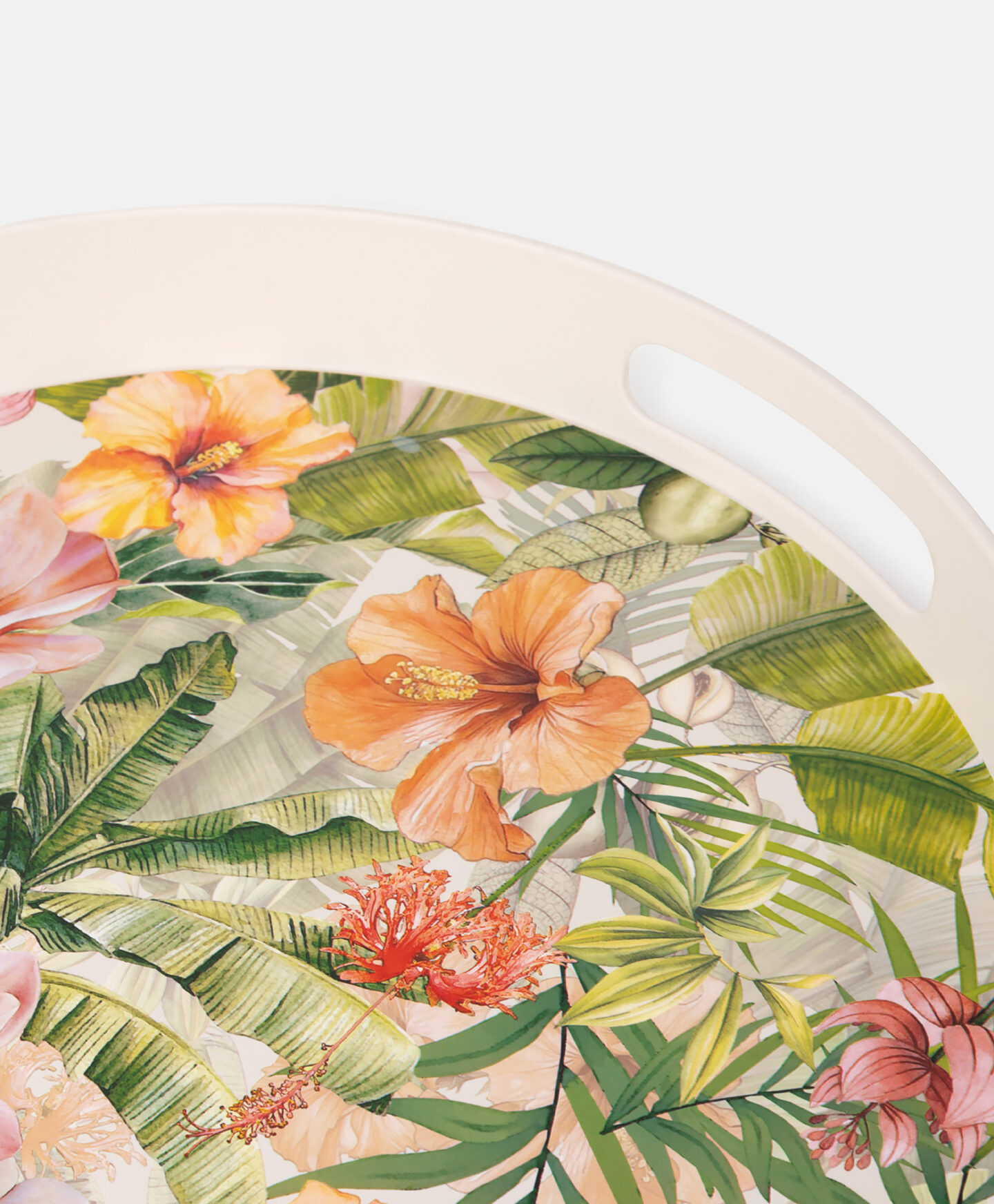 Този поднос за сервиране е олицетворение на летния стил! Многоцветният, уникален мотив на хибискус създава атмосферата на екзотична ваканция. Идеален е за сервиране на храна в градината или на балкона. Той е чудесен и като стилен поднос за свещи или поднос за арома дифузер, създавайки уютна зона за релакс.