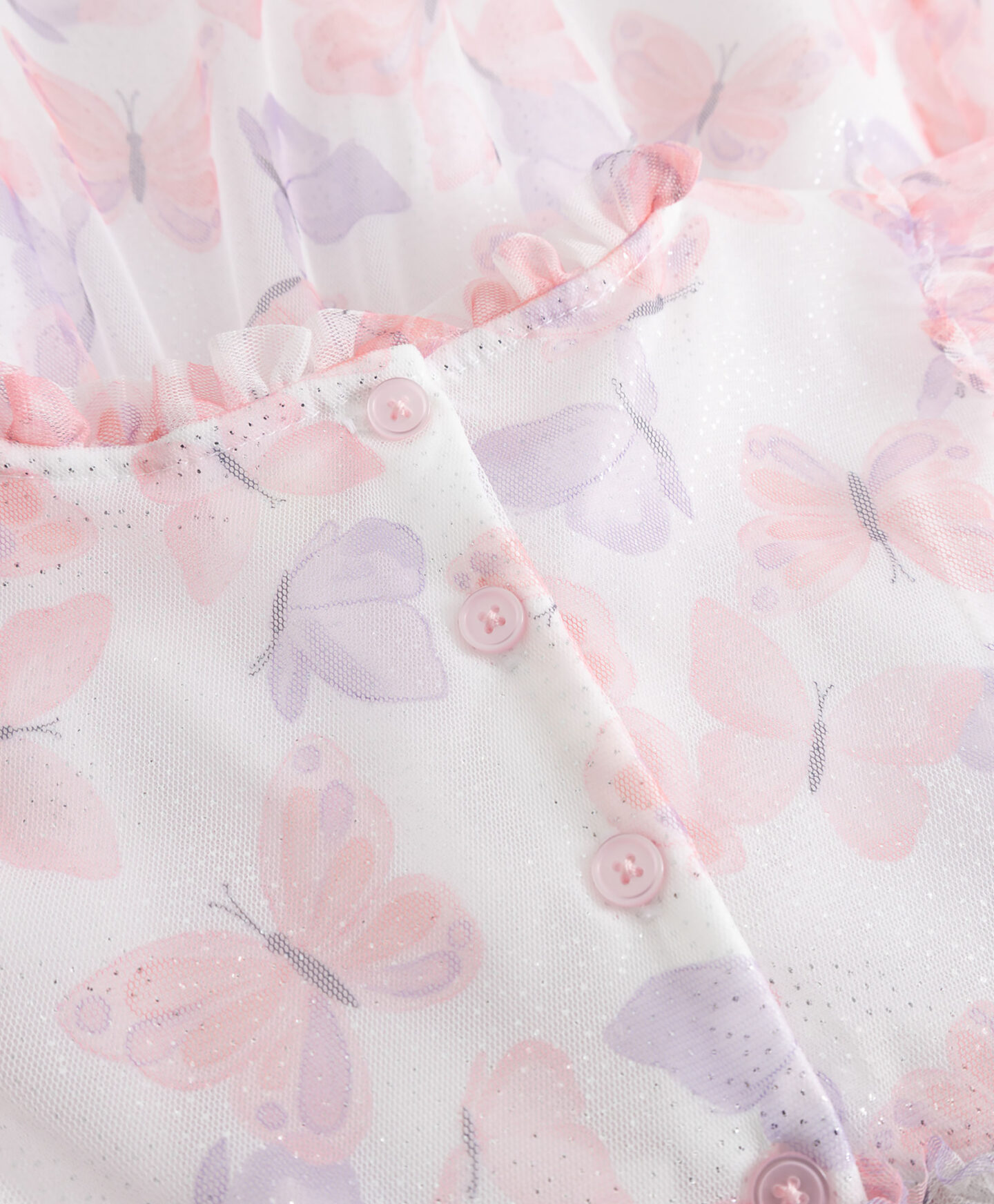 Тази рокля за момичета с мотив пеперуда ще очарова всяка малка дама. Изработена от ефирен тюл, тя е лека и дишаща, осигурявайки комфорт дори в топлите дни. Развяващи се ръкави, воланирано деколте и декоративни волани ѝ придават романтичен характер и вечна елегантност. Лекият материал създава ефирен ефект, а очарователният мотив на пеперуда добавя причудлив щрих към роклята. Фините, блестящи точки ще блестят красиво на слънце, добавяйки наистина уникален щрих.