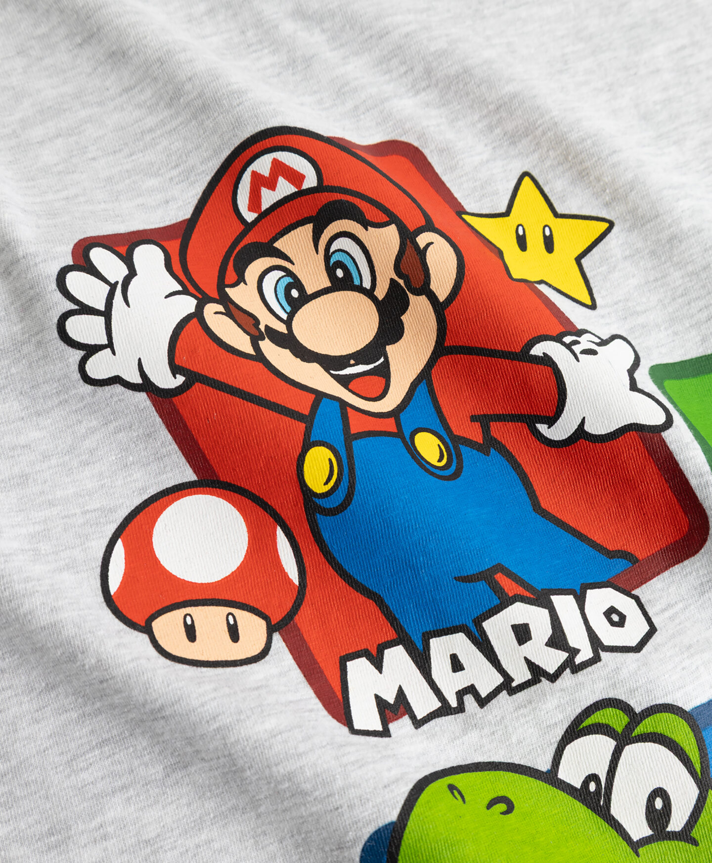 Сивата тениска с емблематичната игра Super Mario за момчета е подходяща за малки фенове на емблематичната игра на Nintendo! Големият принт отпред привлича вниманието, а класическата кройка предлага свобода на движение. Тениската изглежда страхотно в комбинация с дънки, спортни панталони или шорти. Тя е универсален избор за всеки ден.