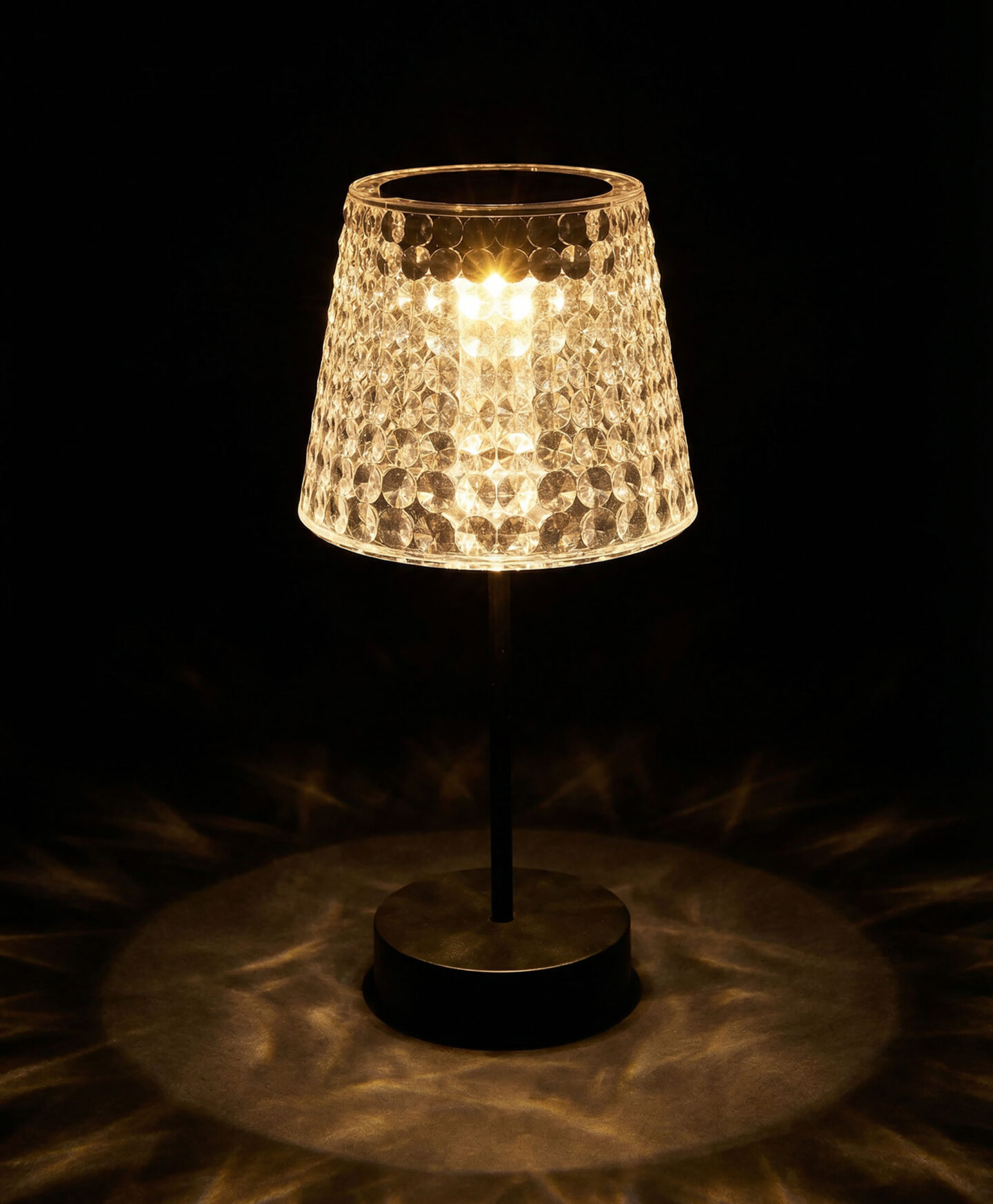 Соларна настолна лампа с кристален абажур ще привлече вниманието на всеки любител на красиви аксесоари. Захранвана от слънчева енергия благодарение на вграден соларен панел, тя работи без кабели и батерии. Абажурът, изработен от кристали, разпръсква светлината по красив и артистичен начин, създавайки романтична атмосфера всяка вечер. Лампата е идеална за използване на маса, перваз на прозореца, както и на тераса, бюро или нощно шкафче, добавяйки елегантност към всяко пространство. Автоматично се включва привечер и се изключва призори, осигурявайки осветление без нужда от поддръжка през цялата нощ.