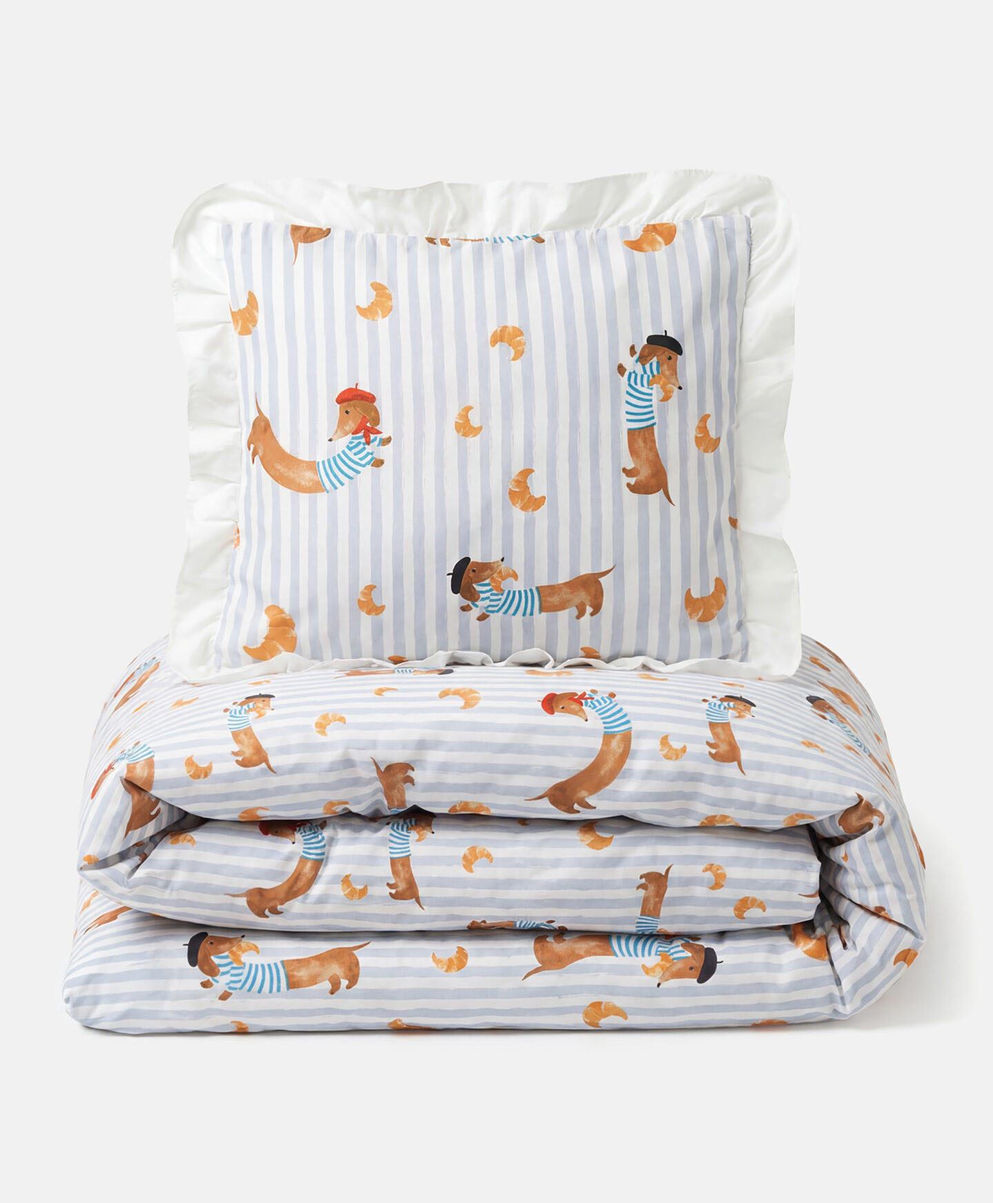 Този комплект спално бельо с шарка на дакел 160×200 см е идеален за тези, които търсят стилно спално бельо за спалнята си. Белият цвят, съчетан с очарователната шарка на кучета с барети, ще добави елегантен щрих към всеки декор. Комплектът включва калъф за завивка 160×200 см и две калъфки за възглавници 50×60 см.