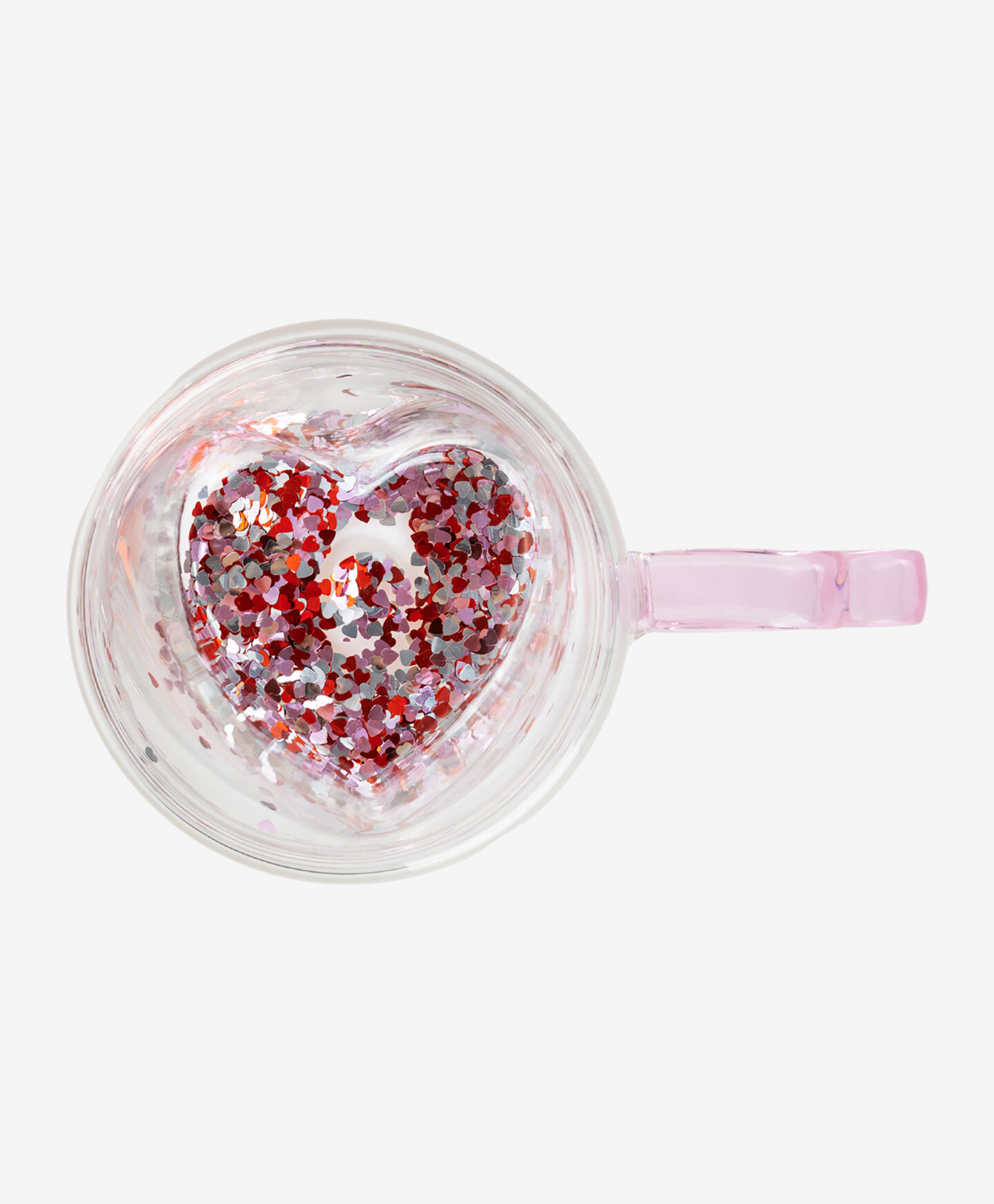 Чашата от боросиликатно стъкло с дръжка във формата на сърце е с двойни стени, пълни с блестящи конфети. Тя е идеална за наслада от сутрешното кафе или чай, а също така е уникален подарък за любим човек. Изработена от издръжливо стъкло, тя е устойчива на ежедневна употреба и лесна за поддръжка.
