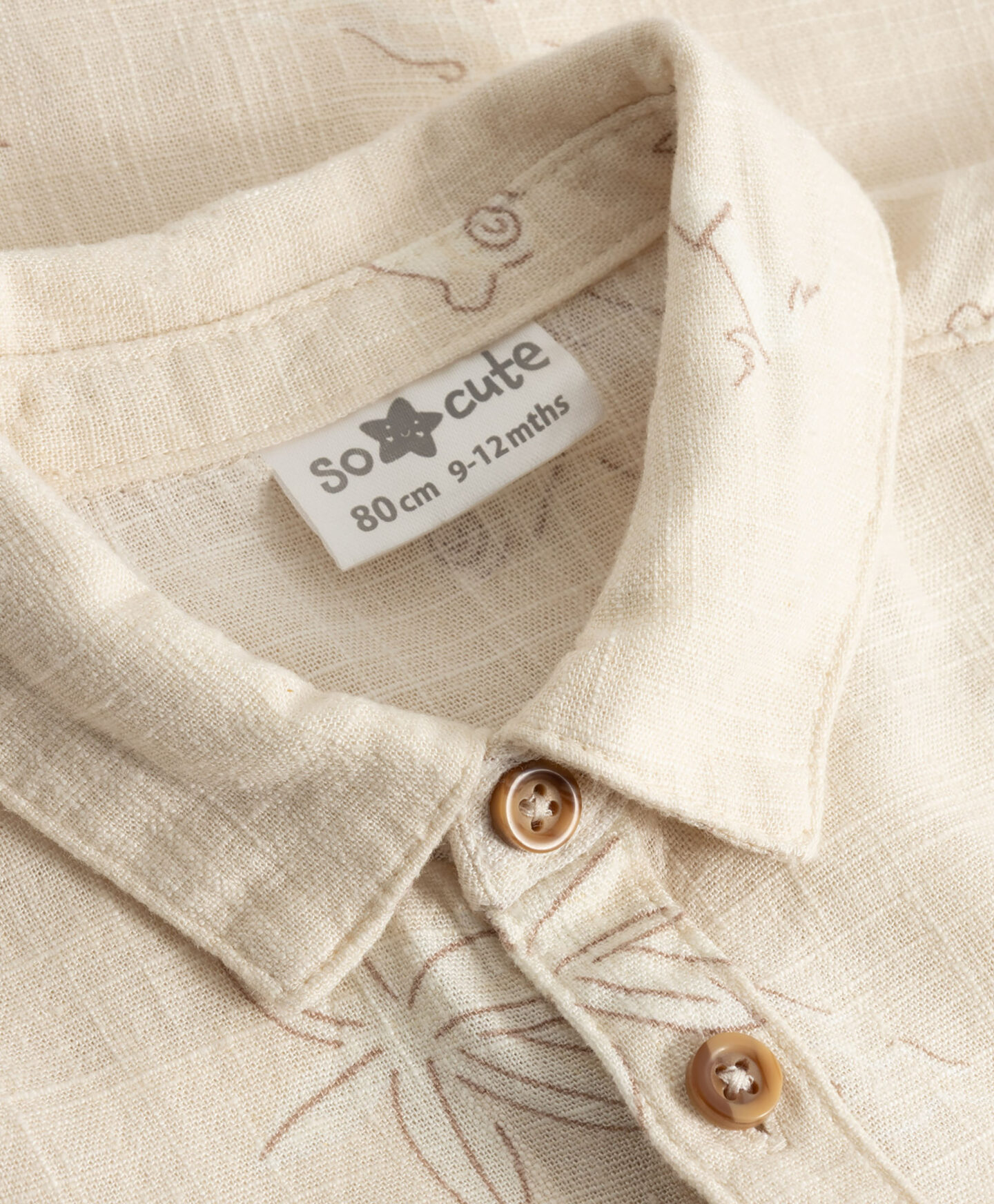 Тениска за бебе момче е пример за облекло, където детайлите са от голямо значение. Изработена от лека, дишаща материя с вискоза и лен, тя ще се погрижи за топлинния комфорт на бебето дори през най-горещите дни. Перфектно скроените ръкави осигуряват пълна свобода на движение, а стилните, внимателно подбрани копчета не само улесняват обличането, но и са елегантен завършек. Сладък модел с коли и палми със сигурност се откроява на фона на класическите дрехи.