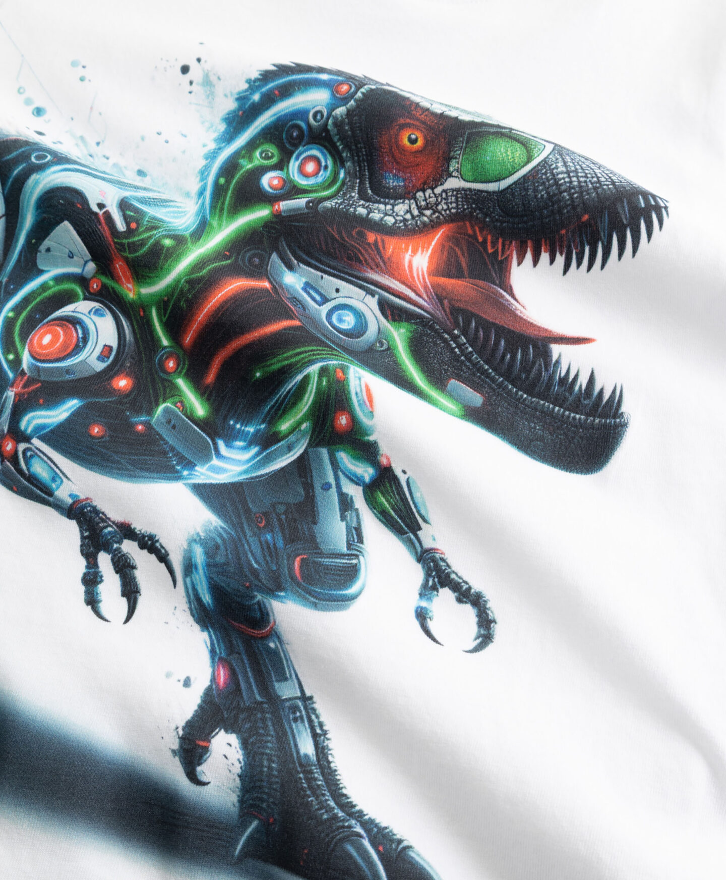 Тениска за момче от 100% памук с динозавър е с къси ръкави и динамична графика отпред. Подходяща е за многопластово носене със суитшърт или самостоятелно в по-топлите дни. Дишащият материал е приятен за чувствителната кожа на детето, предлагайки пълен комфорт при носене. Съчетава се добре както с дънки, така и със спортни панталони.