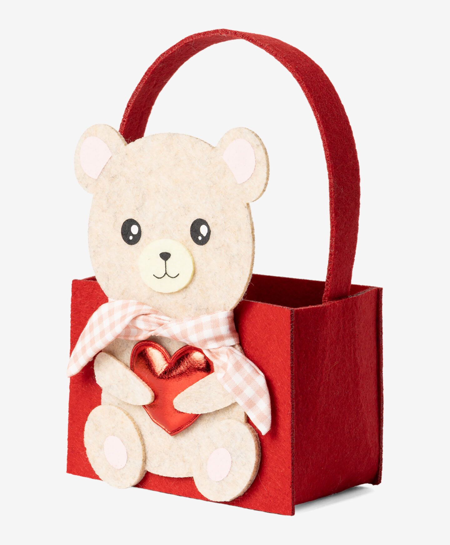 Филцовата кошница с мече е перфектен начин да донесете усмивка и да подчертаете уникалността на подаръка. Тя ще бъде очарователна опаковка за подарък за Свети Валентин, като например шоколадови бонбони, ароматна свещ, бижута или друга романтична дрънкулка. Предлагат се три дизайна, от които да избирате.