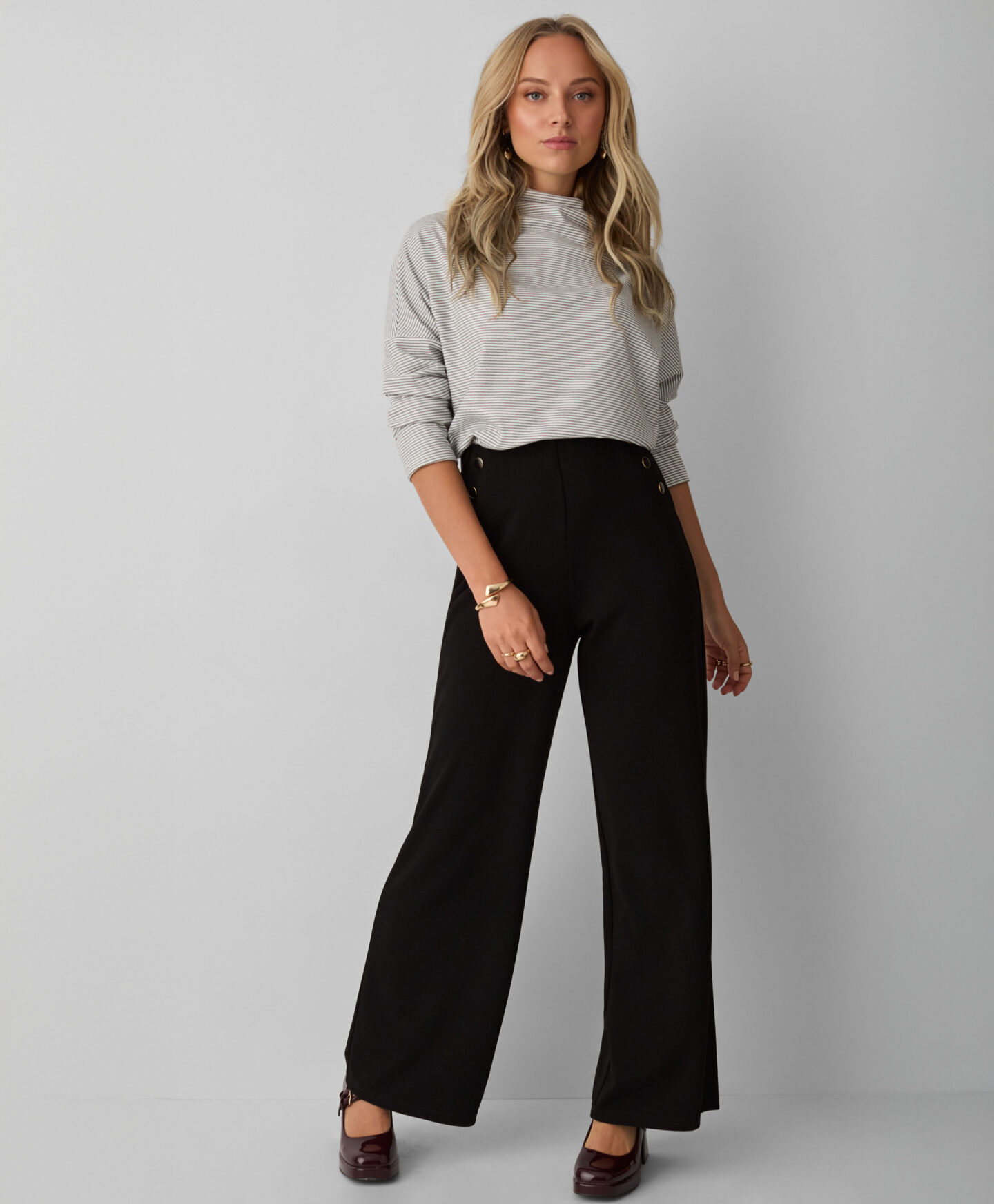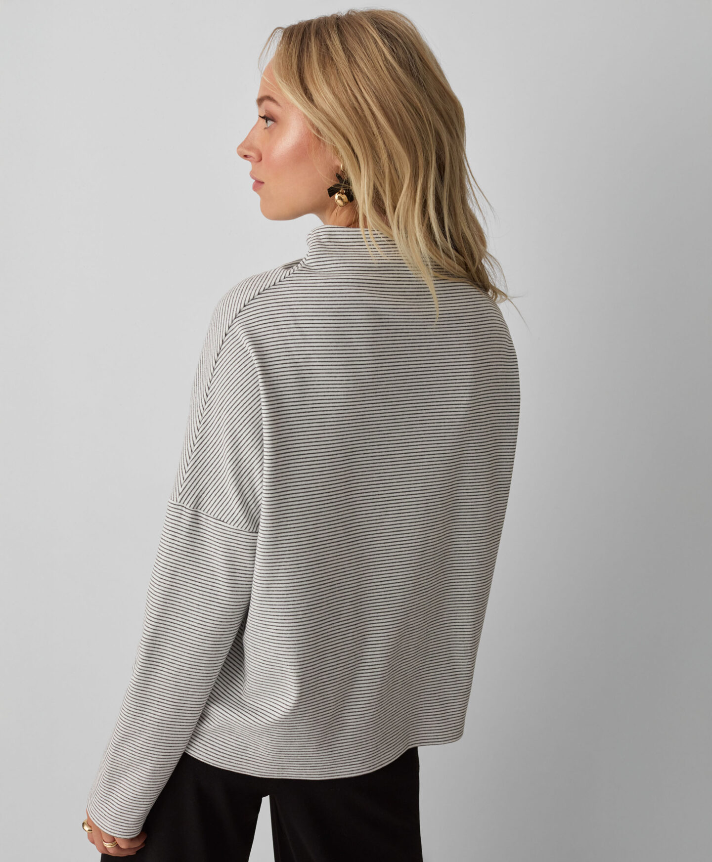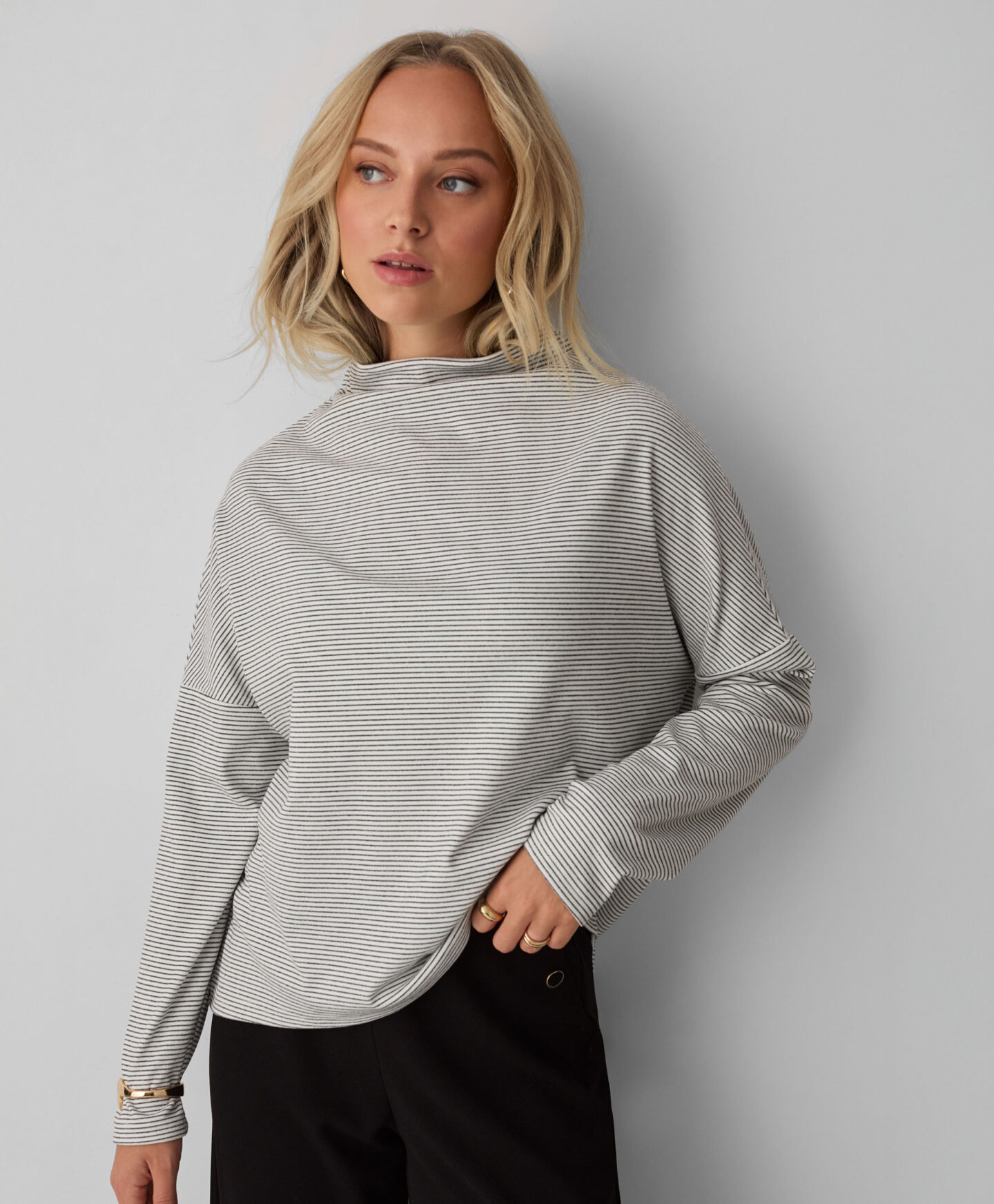 Тази дамска раирана блуза с висока яка изглежда страхотно в комбинация с класически дънки. Тя е лека, приятна на допир и нежно обгръща кожата. Ще бъде отличен избор както за работа, така и за отдих у дома. Високата яка осигурява допълнителна топлина и е идеална за есенния и зимния сезон.
